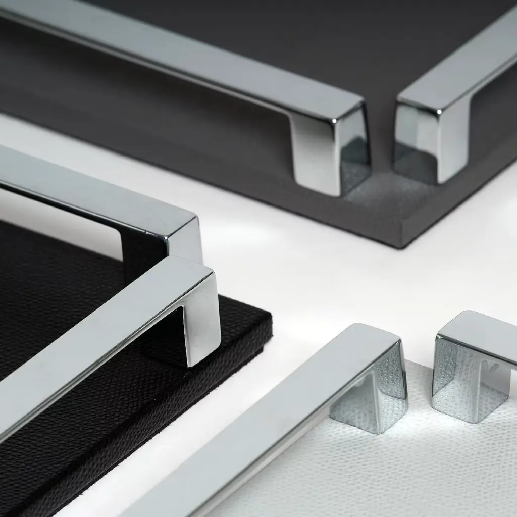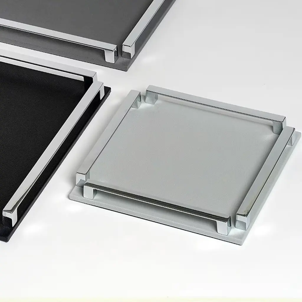 An elegant and unique object, this stunning decorative tray deserves to stay on display even when not in use. Its subtle square silhouette is crafted of wood and upholstered in a light gray leather, the resulting look seamlessly merges with the silver-finished geometric handles that frame the piece. The eye-catching juxtaposition of solids and voids and the uniform color palette make for a dynamic piece that will shine in any interior.\nAdorning a lavish dining table, minimalist side table, or industrial-inspired console, this piece will exude timeless elegance into any decor.