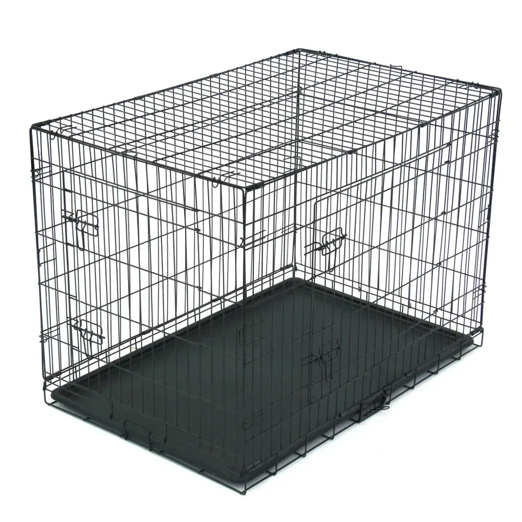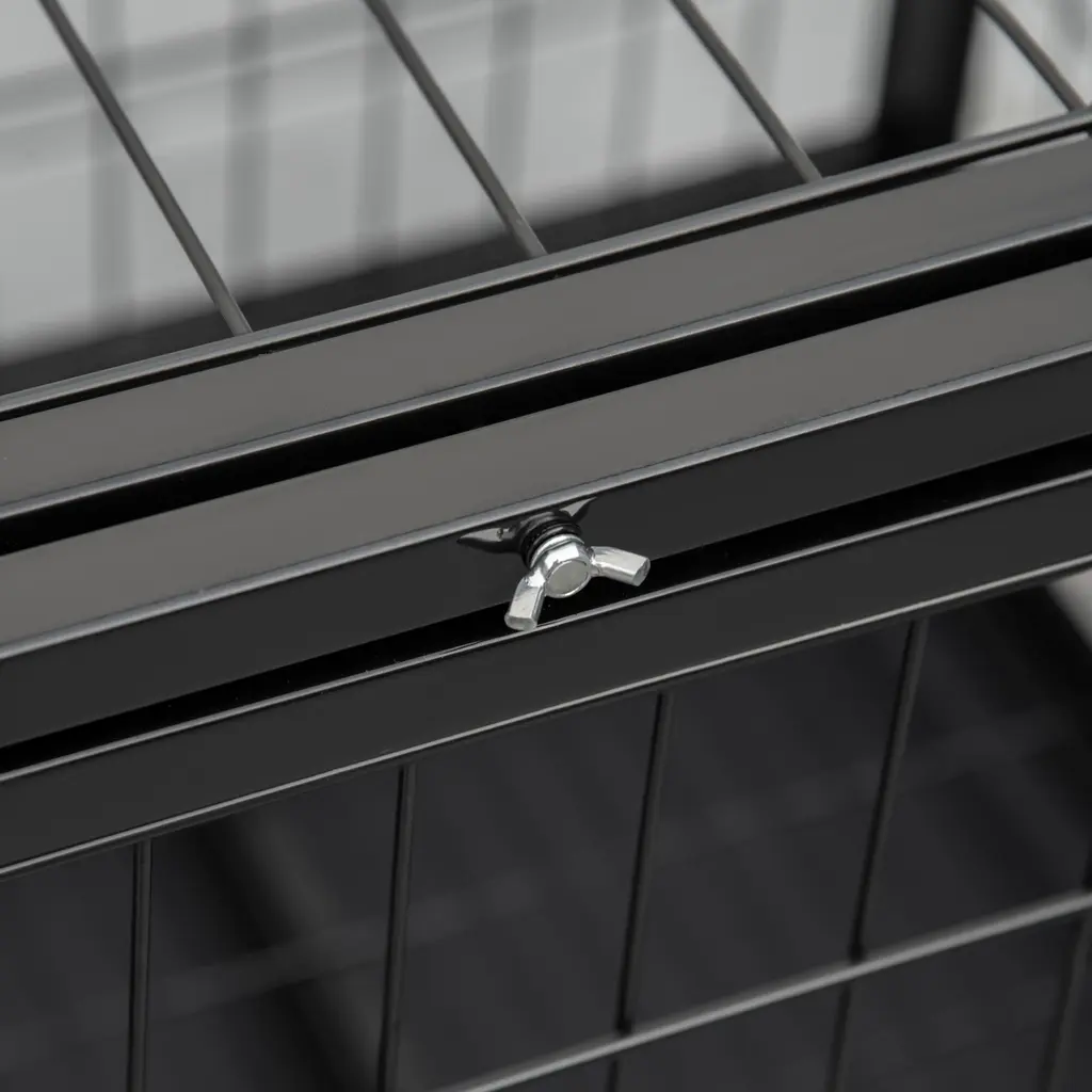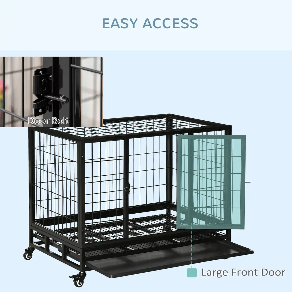 Descriptions:This robust PawHut dog crate with wheels offers your pet a secure, comfortable haven. It features a strong metal tube construction with each bar welded for enhanced durability. The steel dog crate includes dual secure access points with latches to safely contain your dog. It also comes with a slide-out tray for effortless cleaning and lockable caster wheels for smooth mobility.Features:● Constructed from robust metal for daily use● Features front and top doors with latches for convenient access● Comes with a slide-out tray to simplify cleaning● Equipped with four caster wheels for mobility, two with brakes for stability● Suitable for large and medium dogs under 25.6" long, 13.8" tall at the shoulder, and 66 lbs in weight● Requires simple assemblySpecification:● Color: Black● Material: Metal● Overall Dimensions: 36.2" L x 24.4" W x 27.2" H● Inner Dimensions: 34.3" L x 22.8" W x 20.1" H● Front Door Size: 14.2" L x 19.7" W● Top Door Size: 34.3" L x 22.8" W● Tray Size: 34.3" L x 22.4" W● Bar Spacing: 1.8"● Item Label: D02-020
