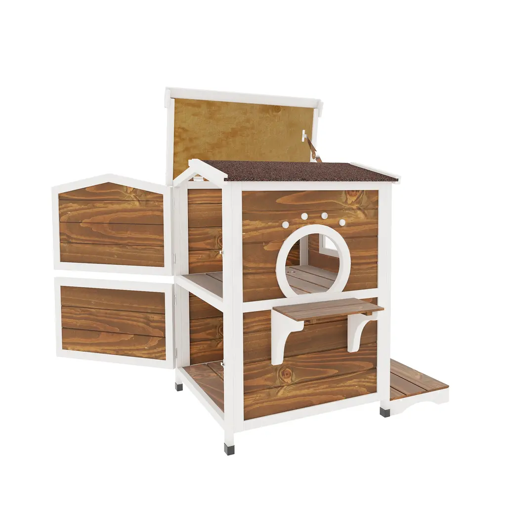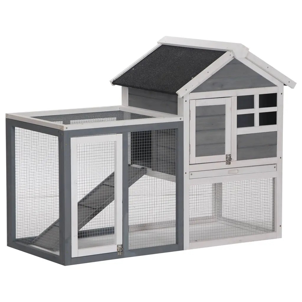 Ideal for a variety of small animals, the Pawhut 2 Story Stacked Wooden Outdoor Bunny Rabbit Hutch / Guinea Pig House offers a safe, sturdy, and comfortable living space. This enclosure features weather-treated fir wood construction with galvanized wire. Each level has a cozy hutch with a generous open run. Pull-out trays and doors offer easy access and cleaning. Features: - Large rabbit hutch with outdoor run, ideal for rabbits, bunnies, and other small animals - Crafted from solid fir wood and steel wires for superior strength and durability - Multiple door design provides easy access for you and your bunny - Heavy duty wire keeps your bunnies inside and safe while keeping other animals out - Ladder gives easy access to upper and lower areas of the living space and outdoor run - Top slant roof is covered with asphalt for enhanced weather protection - Easy slide-out tray included for cleaning to maintain a neat environment for bunnies - Easy assembly requiredSpecifications: - Color: Brown and White - Material: Fir Wood, Steel Wire - Overall Dimensions: 48"L x 24.75"W x 36.25"H - Main House Size: 21.75"L x 14.5"W - Main House Door Size: 12.5"W x 11"H - Run Door Size: 10.5"L x 21"W - Net Weight: 30 lbs