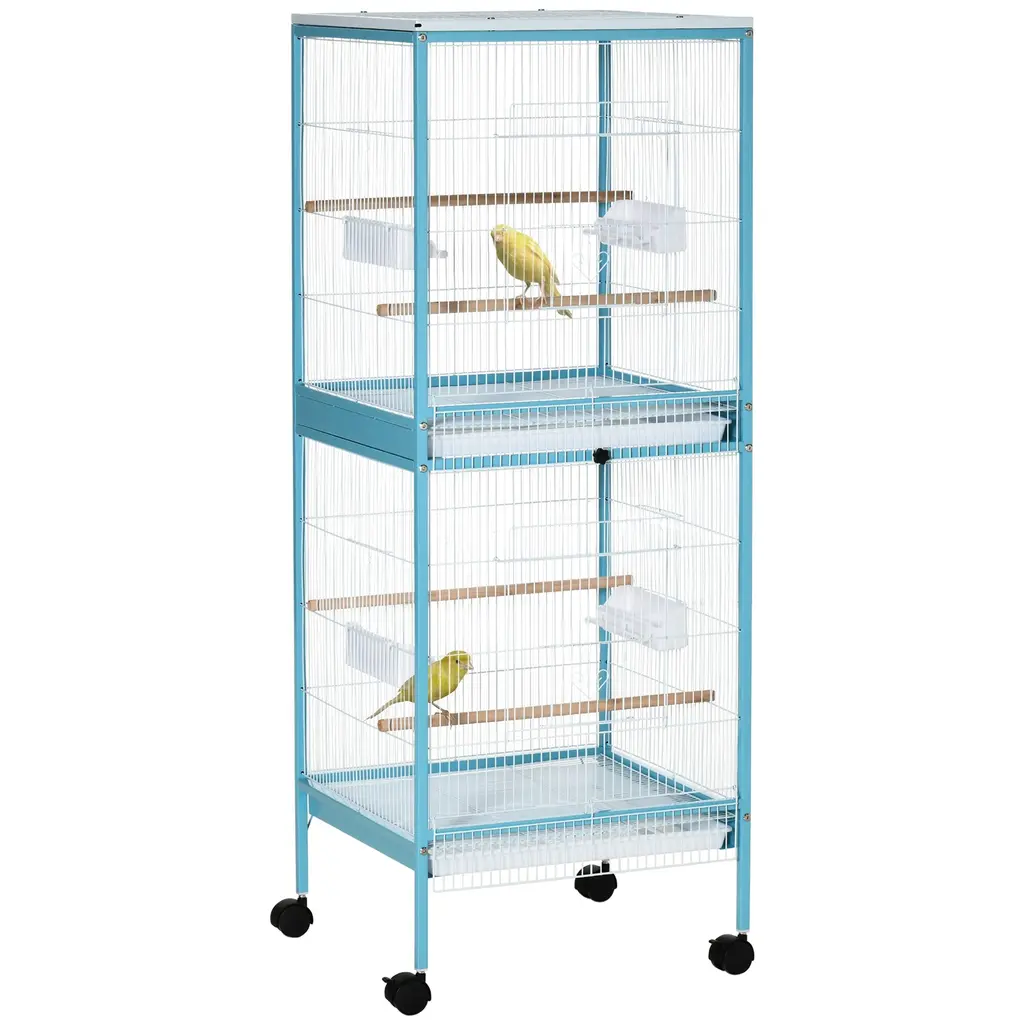 Pawhut 55" 2 In 1 Bird Cage Aviary Parakeet House For Finches, Budgies With Wheels, Slide-out Trays, Wood Perch, Food Containers, Light Blue