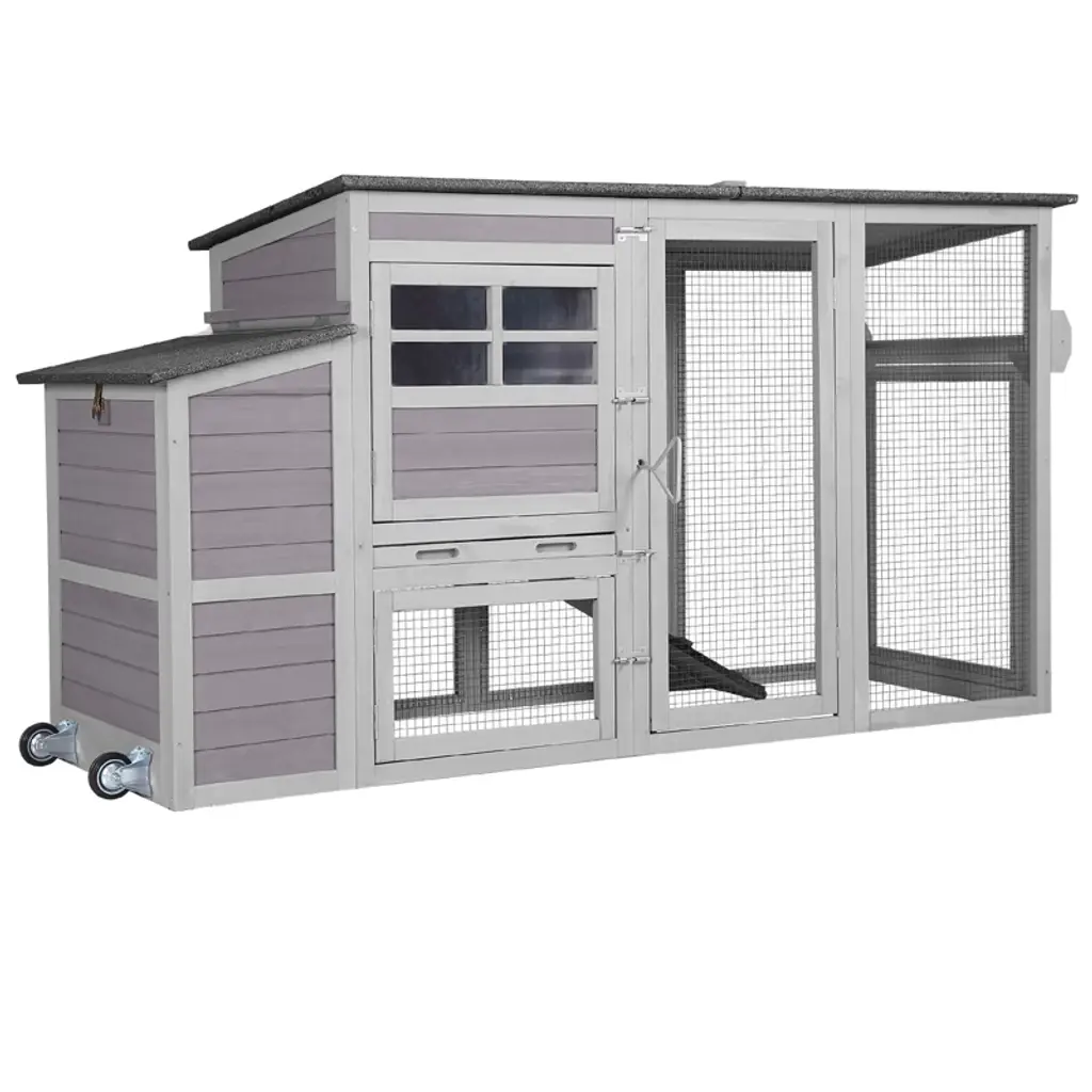 Descriptions:Discover the charm of the PawHut Outdoor Chicken Coop, a splendid haven for your feathered friends! Crafted from fir wood with weather-resistant paint and a reliable roof, this two-level chicken house includes a cozy nesting box and spacious running boxes. Cleaning is a breeze with the removable sliding tray, making it a delightful choice for any backyard farmer.Features:● Two-level design provides main house and running boxes● Fir wood frame with water-based paint shields chickens from the weather● Reliable roofing ensures protection against the elements● Large coop includes nesting box, sliding tray, and connecting ramp● Made of heavy-duty wire, it ensures safety from predators and ample ventilation● Removable sliding tray makes cleaning simple and quick● Suitable for 2-3 chickens.● Assembly RequiredSpecification:● Color: White, Blue, Black● Materials: Fir Wood, Plastic● Overall Dimension: 55.5" W x 50" D x 47.6" H● Main House: 33.3" W x 25.2" D x 30.7" H● Nesting Box: 22.6" W x 12.8" D x 15.4" H● Run Box: 33.3" W x 25.2" D x 15.4" H(under the main house), 33.3" W x 25.2" W x 46.3" H(side)● Area: 12 ft²(overall), 5 ft²(main house), 2 ft²(egg box)● Door Size: 15.9" W x 16.9" H (main House), 22.4" W x 33.1" H(run Box), 11.4" W x 11.2" H(inside Door)● Tray Size: 31.3" W x 24.2" D x 1.4" H● Ramp: 24.8" L x 8.1" W● Item Label: D51-449V00WT