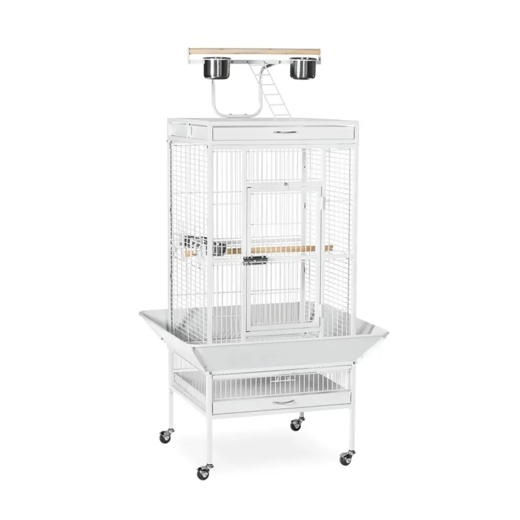 PawHut's budgie cage is made specifically to provide a homey bird-friendly environment that feathered friends will feel comfortable in. Three perches, two inside, and four food and water bowls, split between the inner and outside spaces, give your feathered friend access to their needs anywhere. Two hooks above the outer perch allow several fun toys to hang. Shelf storage saves room elsewhere, and wheels ensure portability is possible.