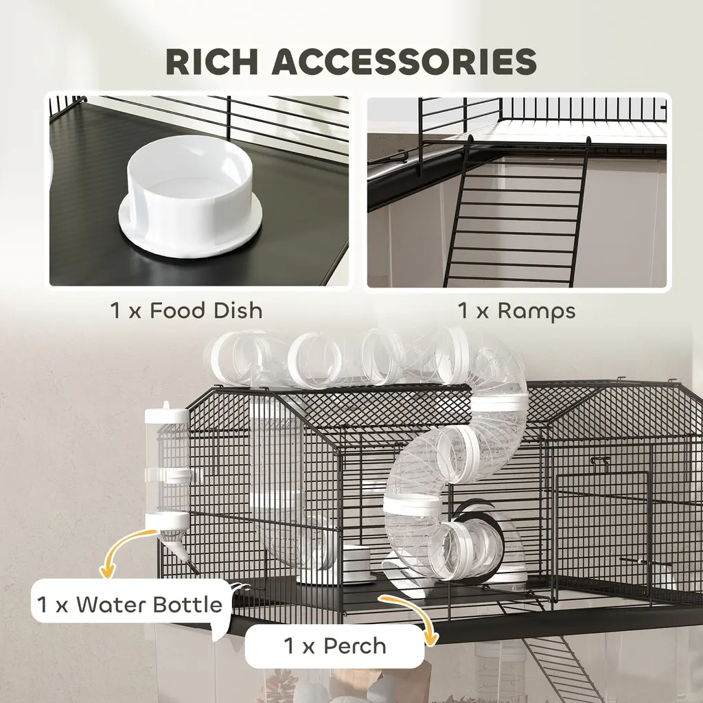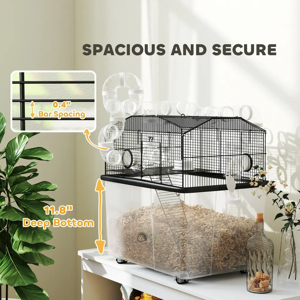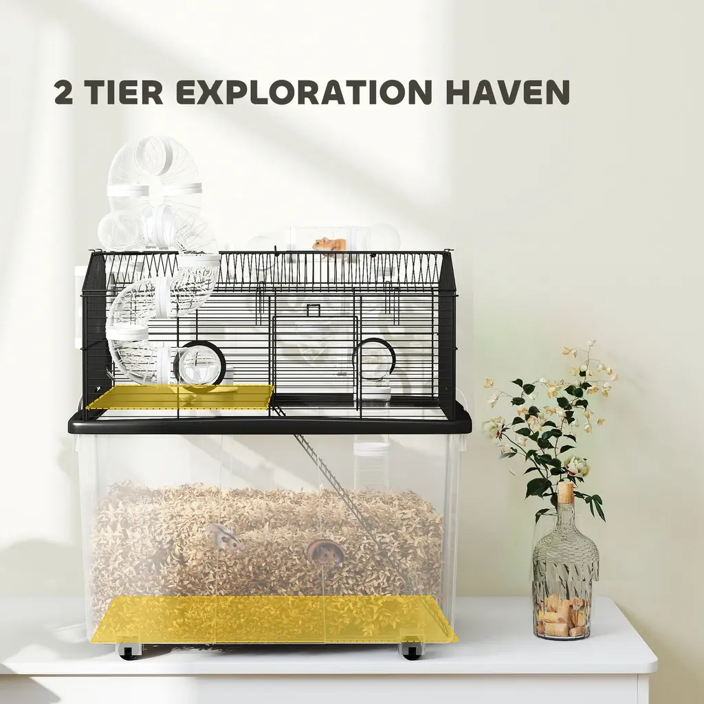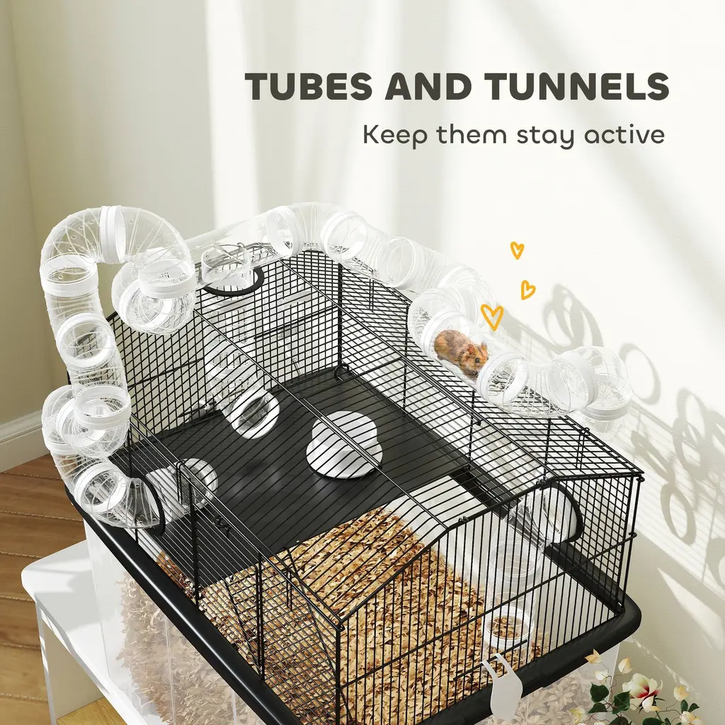 Descriptions:Discover the PawHut hamster cage, a spacious 2-tier world with a tube system for endless exploration. This large hamster cage features an 11.8" deep tray, ensuring a playful yet tidy habitat. It comes with all the essentials: perch, ramp, water bottle, and food dish, making it a delightful haven for any dwarf hamster or gerbil. Plus, it's easy to move with handy bottom wheels!Features:● Two-tier layout offers lots of space for active hamsters● 2" tube system encourages playful exploration● 11.8" deep tray simplifies maintenance and enhances cleanliness● Includes perches, ramps, water bottle and food dish● Dual doors and buckle design allow easy access and cleaning● Four wheels enable effortless relocation around the home● Suitable for dwarf hamsters and gerbils, excluding Syrian varieties● Assembly requiredSpecification:● Color: Black● Material: Steel, Plastic● Overall Dimensions: 22.8" L x 16.9" W x 22.4" H● Plastic Tray: 22.8" L x 16.9" W x 13.8" H (Overall), 20.1" L x 14.2" W x 11.8" H (Inner)● Cage Size: 20.5" L x 14.6" W x 9.4" /7.5" H● Front/Top Door: 4.9" W x 4.9" H● Platform: 13.8" L x 9.8" W● Ramp: 15.7" L x 4.3" W● Feeding Bowl: 3.1" Dia. x 1.4" H● Water Bottle: 4.2 oz.● Straight Pipe: 2.2" Dia. x 3.9" L● Bend Pipe: 2.2" Dia.● Tee Pipe: 2.2" Dia. x 3.9" L + 2.2" Dia. x 2" L● Bar Spacing: 0.4"● Item Label: D51-475V01BK