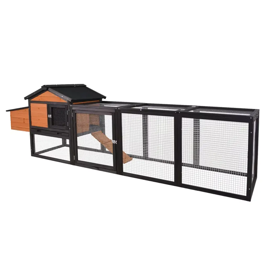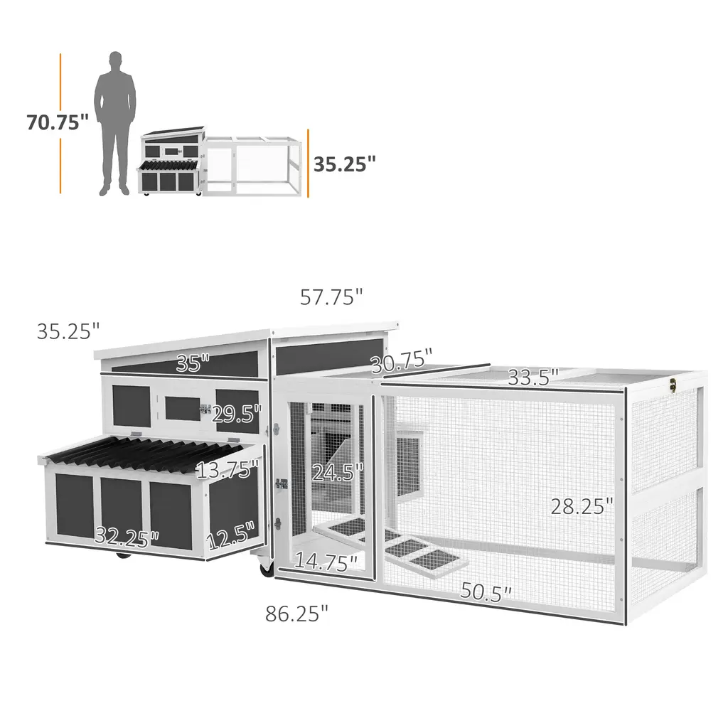 Descriptions: This PawHut chicken house has a spacious design for the run and main house to have a comfy amount of room. With earth-safe materials, you can avoid unhealthy ingredients to treat your animals with care while treating the planet with care. A big hen coop is a happy home. Let your cage be luxuriously large. Features: ● Large and roomy with 10 sq. ft in the run and 4.2' from end to end● Outdoor paint and plastic wave roof protect against rainwater for weather protection● Earth-safe paint● Steel wire is strong for long-term use● Big main house and nesting box in both side areas● Pull-out tray for easy cleaning● Openable top and multiple doors for easy catching● Suitable for 1-6 chickensSpecification:● Color: Dark Gray● Materials: Fir Wood, Plastic, Metal● Overall Dimensions: 50.75" L x 57.75" W x 35.25" H● Main House Dimensions: 30.75" L x 35" W x 29.5" H● Main House Door: 12" L x 20.75" W● Nesting Box Dimensions: 32.25" L x 12.5" W x 13.75" H● Run Dimensions: 50.5" L x 30.75" W x 28.25" H● Run Door Dimensions: 14.75" L x 24.5" W (Side Door), 33.5" L x 30.75" W (Top Door) ● Ramp Dimensions: 12" L x 20.75" W● Activity Areas: 7 sq. ft (Main House), 10 sq. ft (Run), 3 sq. ft (Single Nesting Box)● Tray Dimensions: 27.75" L x 34.25" W x 1.25" H● Item Label: D51-408V00CG