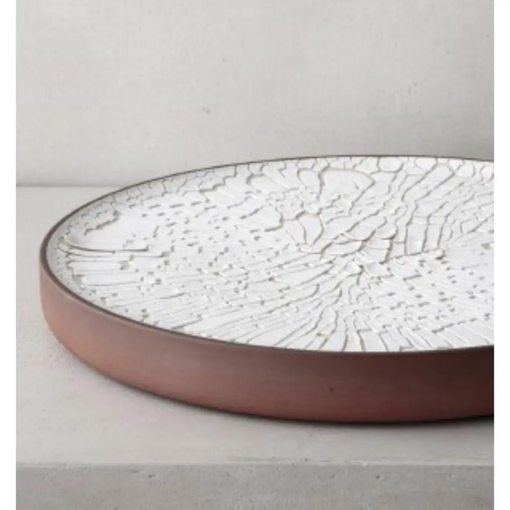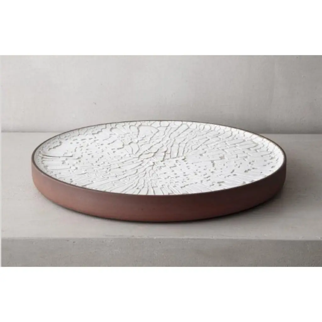 Paysages Desértiques super big, tray by Josefina MunozPaysages Desértiques CollectionDimensions: H4 x D40 cmMaterial: ceramicsAvailable in: mini, small, medium, big and set. This project is the result of the experimentation with a particular composition of glaze that cracks when fired, revealing a unique texture each time unique. The fragile appearance of the technique bestows each piece with the invaluable notion of the ability of ceramic to surprise.The work of Geneva-based Argentine designer Josefina Munoz, takes a macro perspective to the world of contemporary design and the influential sometimes seemingly distant factors that determine the industry’s course. With training in Design for luxury and Craftmanship, she designs with a keen sense of underlying meanings and symbolism that go hand in hand with quality. Nominated for Swiss Design Awards 2019, Winner of the Art & Design Indosuez Award 2019 of the Art and Crafts Switzerland Association, she participated in exhibitions around the world, including the Milan Design Week (2016, 2017, 2018) “De Mains de Maîtres” in Luxembourg (2017), the London Design Festival at the Victoria and Albert Museum in 2015 and Collect 2019 at Saatchii Gallery in London. Her personal work in close partnership with true artisans in different fields, finding the particularities of individual expertises that offer a whole new world of artistic expressions. With her creations, she aspires to give the opportunity for the viewer to live a moment of serenity. As a designer, she seeks to inspire, inform and provide a voice to artistic professions such as ceramic, stone and glass, among others. After starting her own studio in 2016, she is perpetually seeking out new experiences and collaborations around the world.