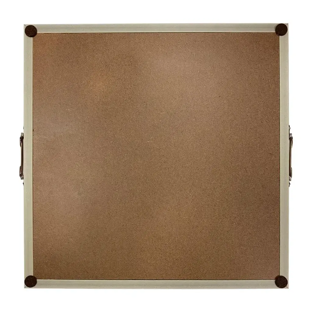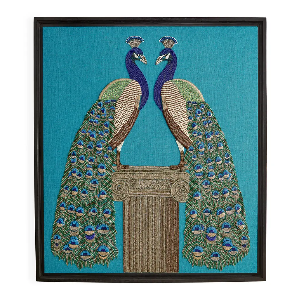 This decorative tray is beautifully finished with a blue and red peacock and flower PRINT of an 1830's era antique fabric sample. You may notice a slight water stain above one of the peacocks- this was on the original sample and we chose not to remove it. We believe it adds to the antique look of this piece. The tray is designed with gold and black resin frame molding that frames the print behind glass with a sturdy backing, and is accented with antiqued brass handles. Four felt pads keep the tray stable on almost any surface. Perfect for organizing your tabletop or ottoman, or display it upright on a shelf. It's almost too pretty to cover with books or trinkets! Dimensions: • Tray frame 17-1/2" x 17-1/2" • Tray frame height 1"