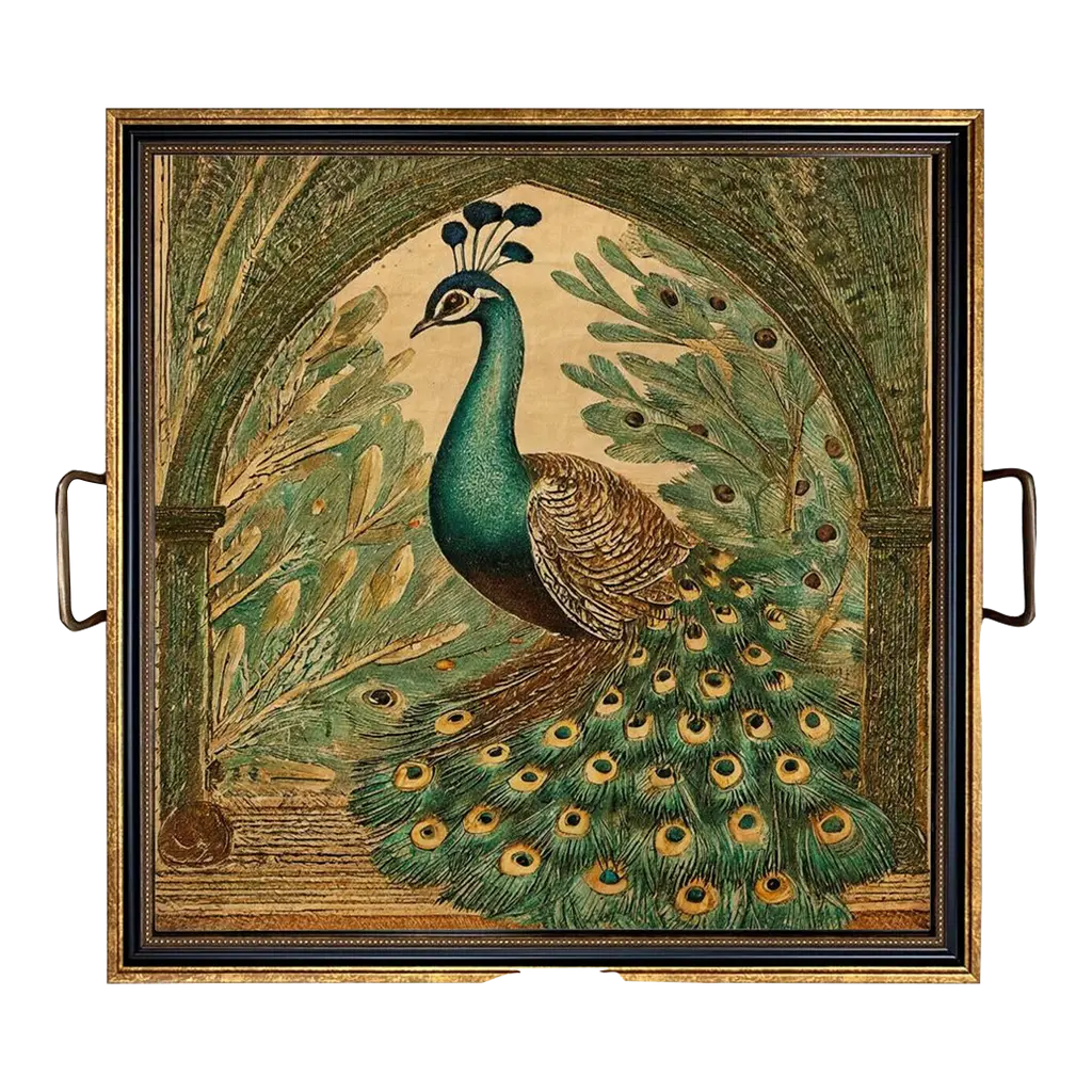 Peacock And Flower Decorative Tray With Brass Handles, 17-1/2" X 17-1/2"