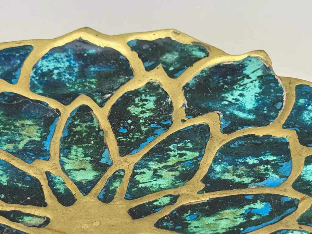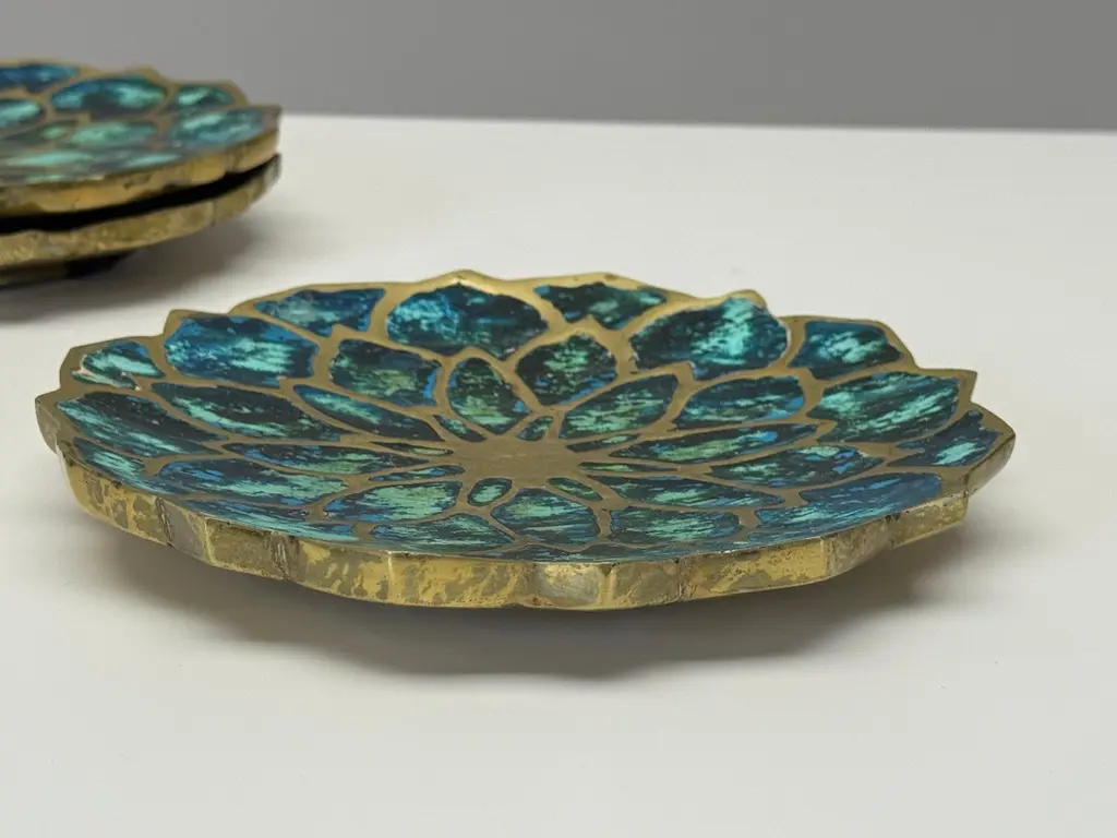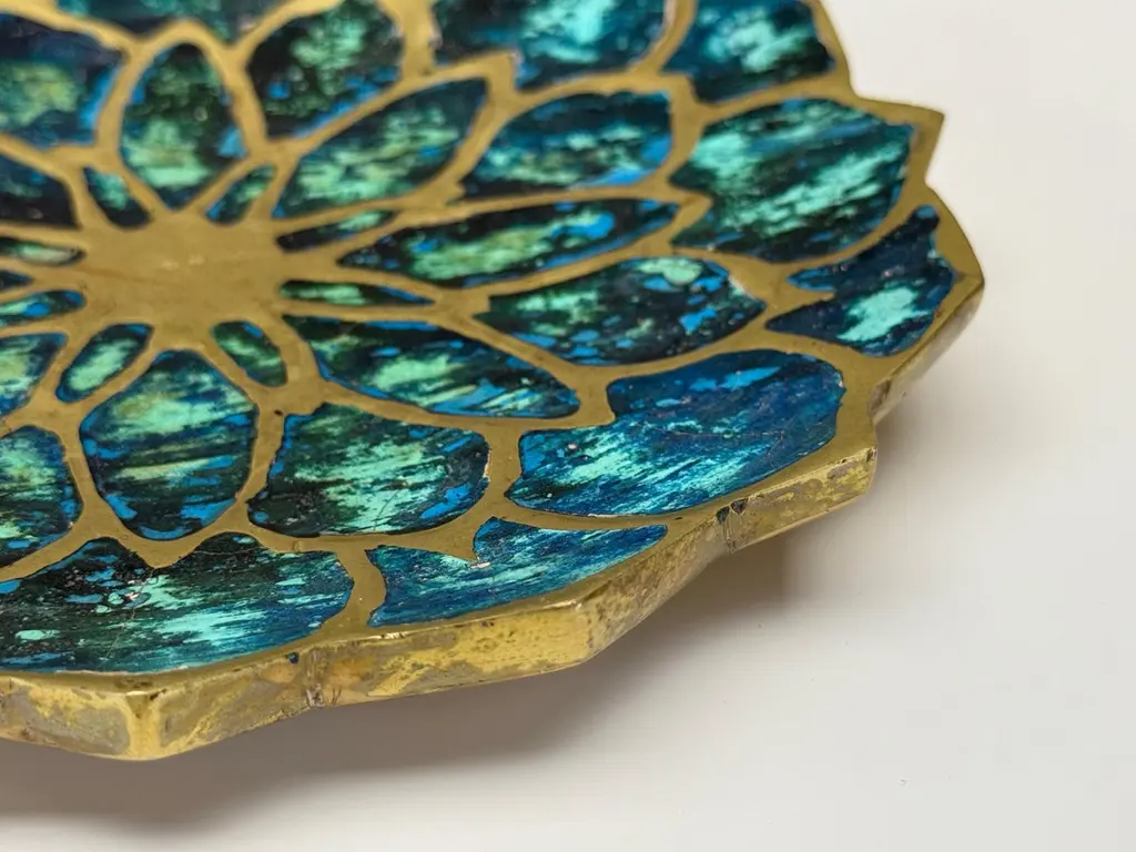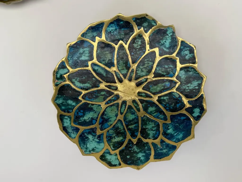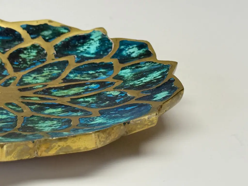 A lotus shaped tray in solid brass with faux stone inlay by Pepe Mendoza. Three available.