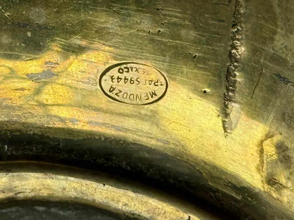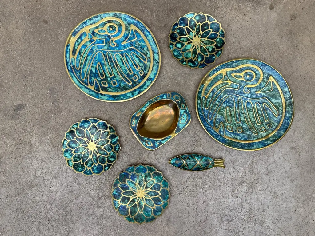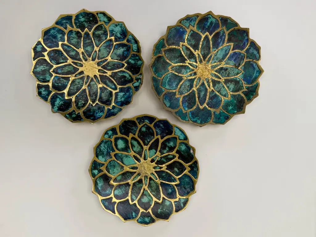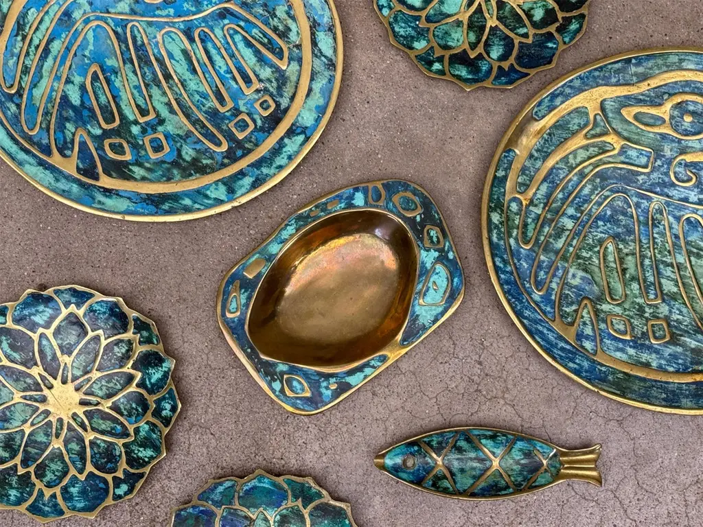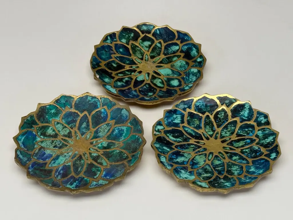 A lotus shaped tray in solid brass with faux stone inlay by Pepe Mendoza. Three available.