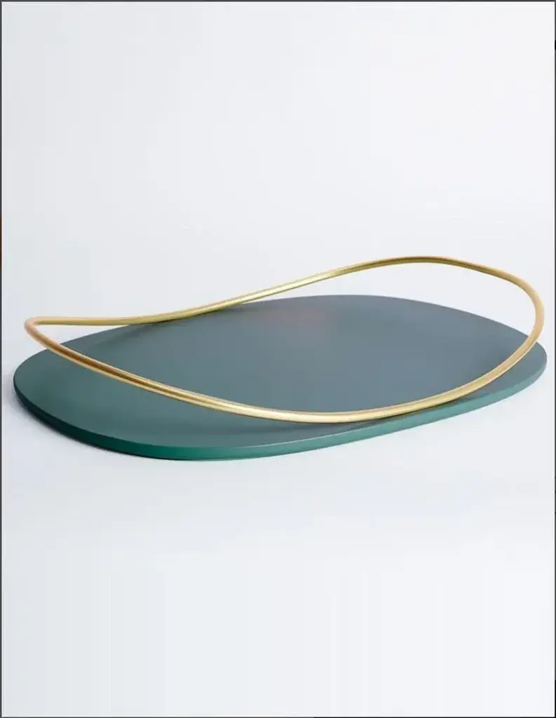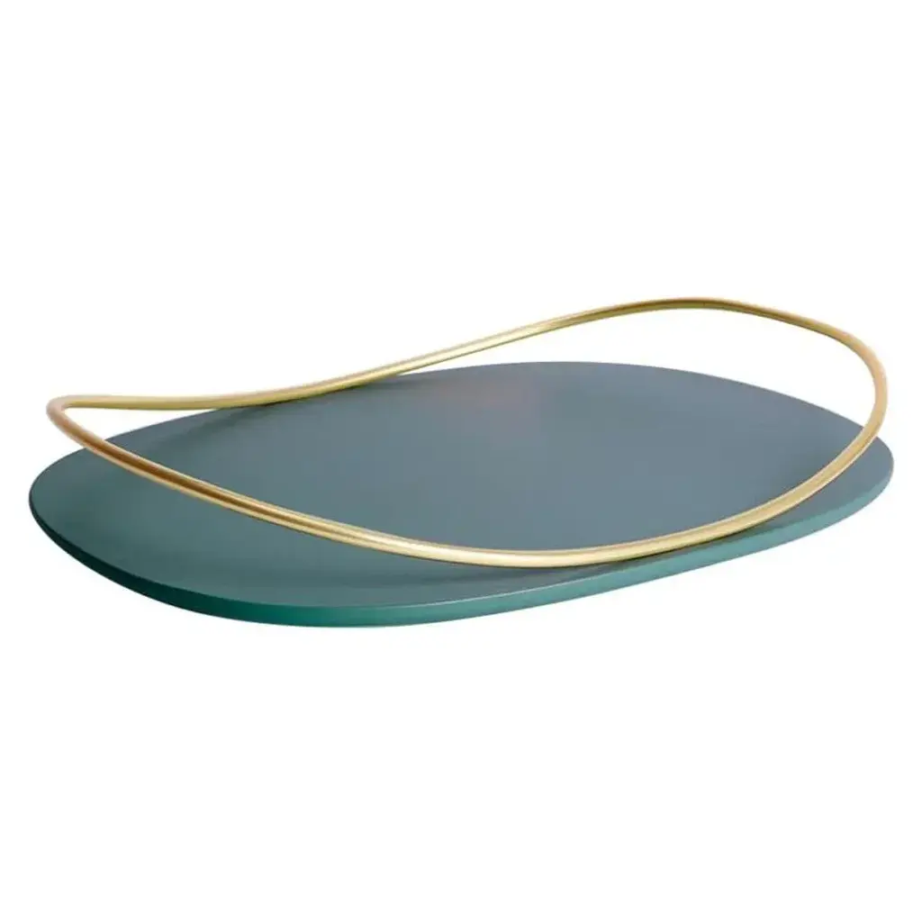 Petrol green touché c tray by mason editions. Dimensions: 36 × 48 × 6.4 cm materials: iron and mdf colours: taupe, cotto, burgundy, sage green, petrol green. A light metal rod that rests on the surface and then lifts up, almost touching the surface with a quick tap, a movement that defines the handles of touché trays. The organic shape of the oval base communicates with the thin tubular, giving the impression of a perpetual undulatory motion, which seems to vanish when the trays are looked at from above. This oval tray with an oval handle won’t go unnoticed in the eyes of your party and dinner guests. The round mdf base is available in several colours, with a slim handle in galvanized 24k gold. A versatile design object, used to serve food and drinks as well as display jewellery and bedroom vanity.