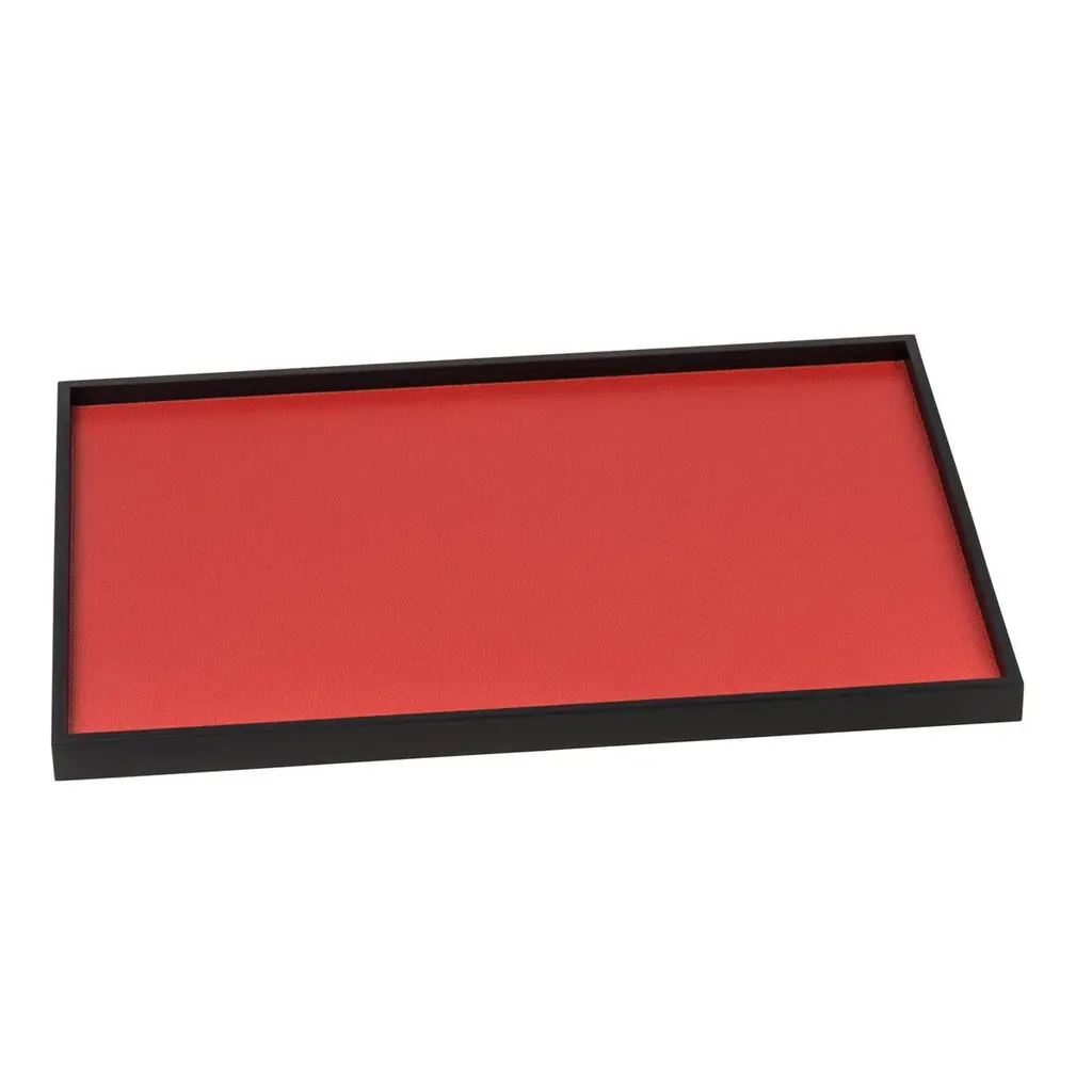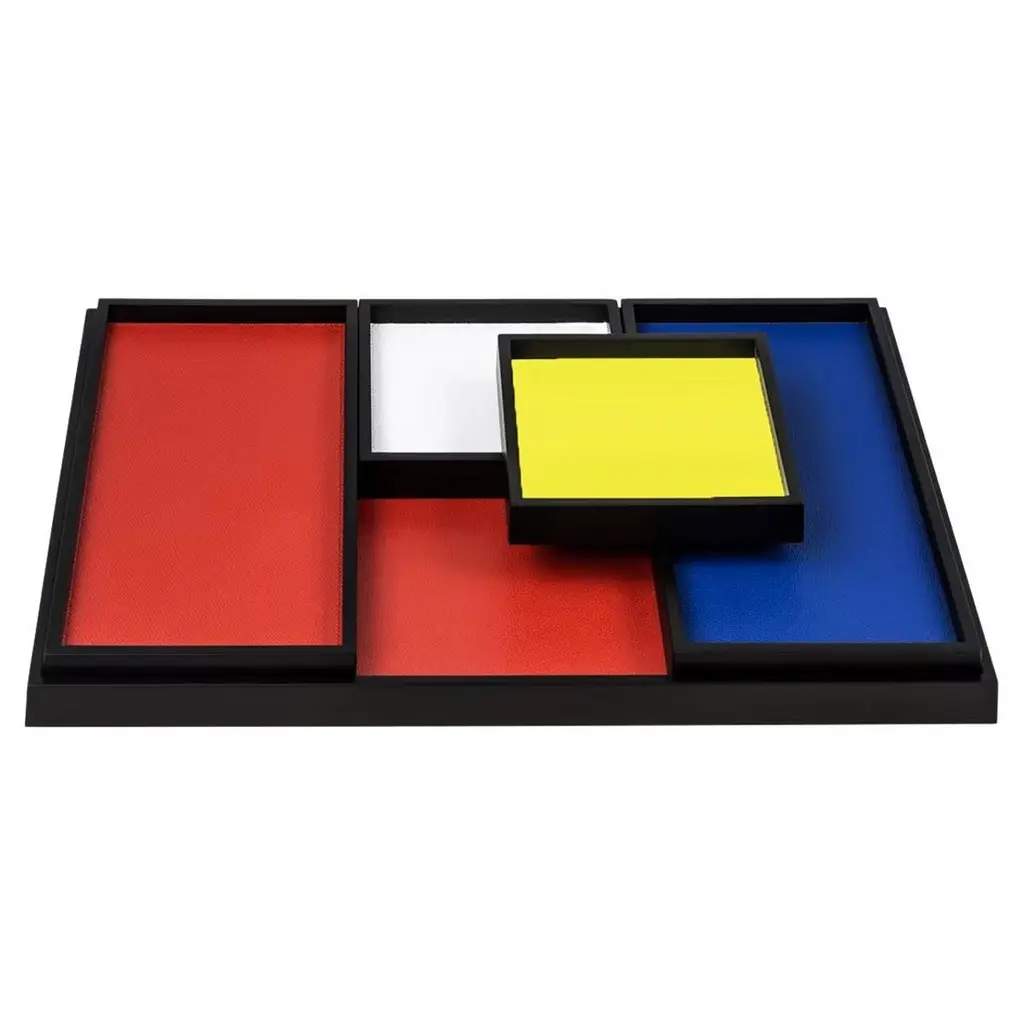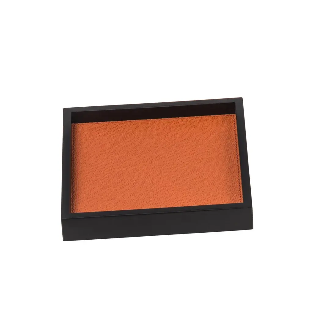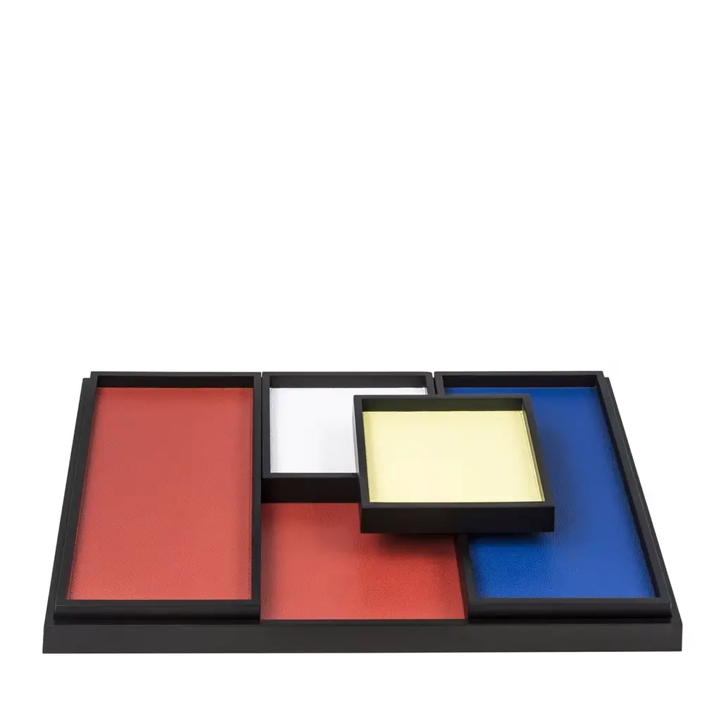 Part of the Phorma series, this set of trays is a celebration of modern design and traditional artisanal techniques. The structure of each piece is in walnut wood that can be finished with a dark wengé wood (like in this case) or stained walnut. At the bottom of each tray a lining of fine leather adds a splash of color that can be customized. The set consists of two small rectangular trays, two small square trays, and one large rectangular tray.
