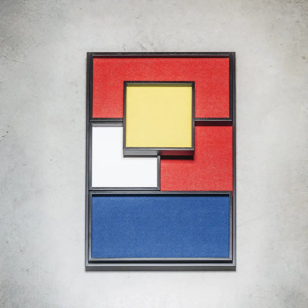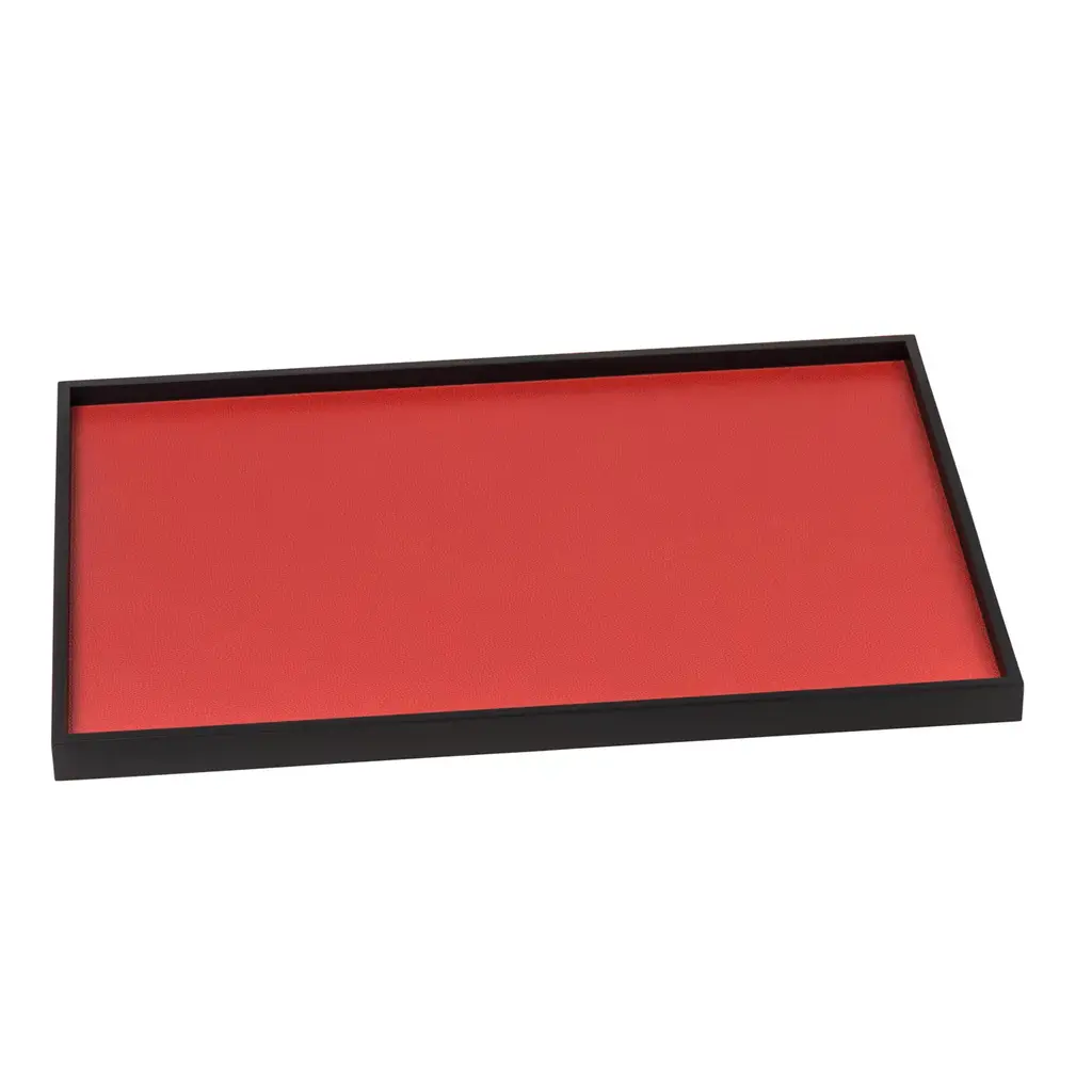 Part of the Phorma series, this set of trays is a celebration of modern design and traditional artisanal techniques. The structure of each piece is in walnut wood that can be finished with a dark wenge wood (like in this case) or stained walnut. At the bottom of each tray a lining of fine leather adds a splash of color that can be customized. The set consists of two small rectangular trays, two small square trays, and one large rectangular tray.