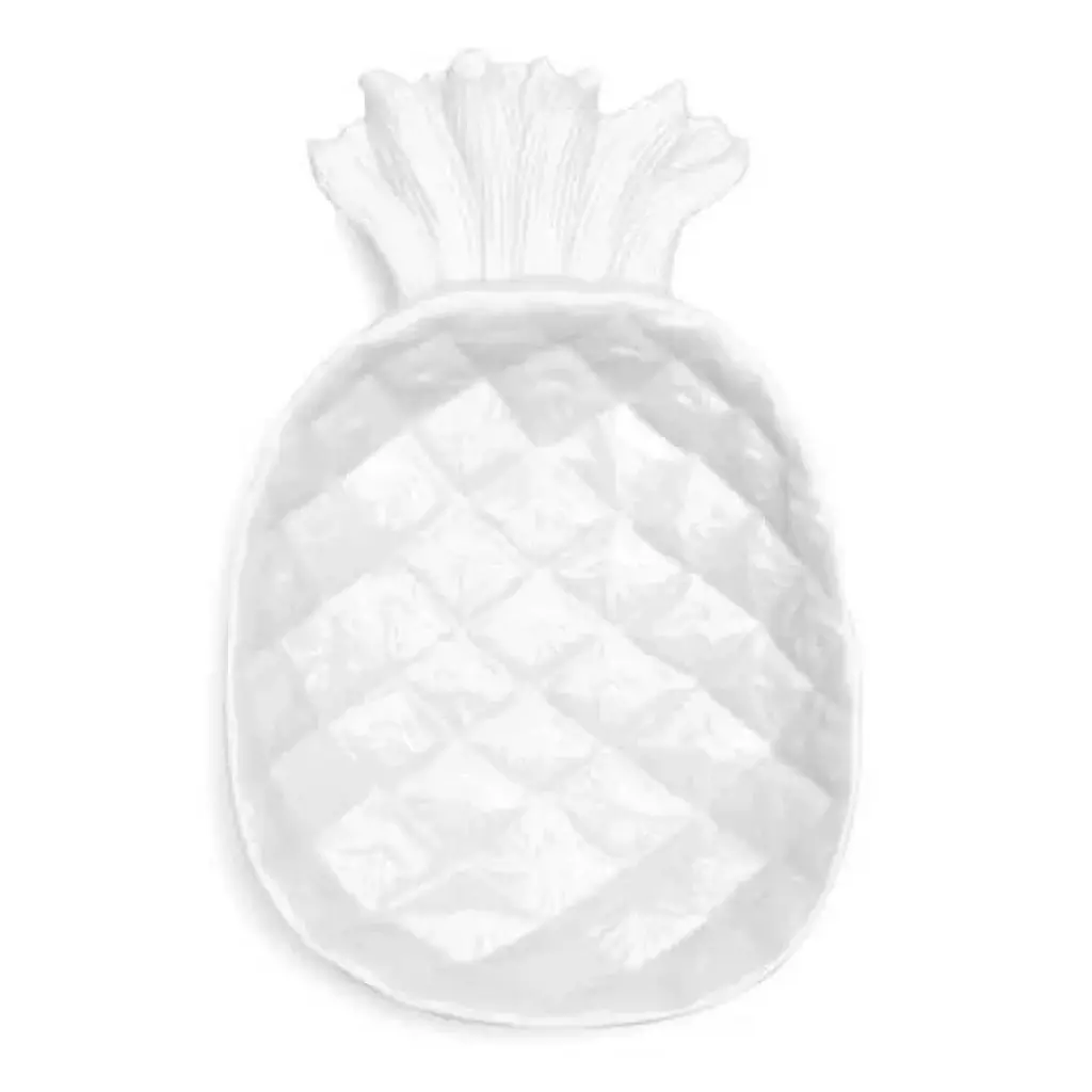 Celebrate the coming of warm weather with this unique Pineapple Chip and Dip Tray from Arthur Court. Crafted in the shape of pineapple, this piece features a mark within each patterned square on the interior to signify its spiky texture. A wavy design walls off the fruit's crown, while lines distinguish each leaf within and around it. This tray was handmade in sand-cast aluminum.