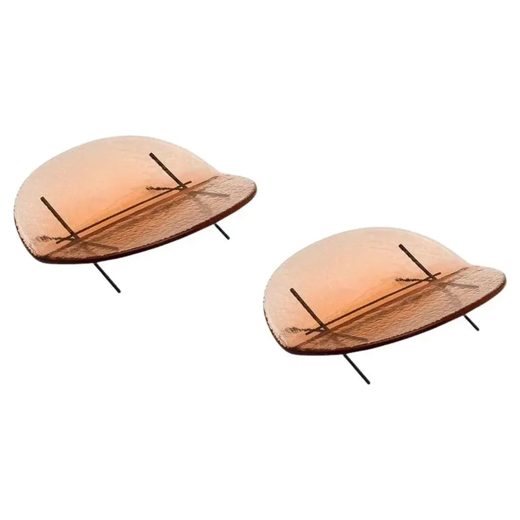 Set of 2 pink Hakou A Trays by Mason Editions Dimensions: 39 × 32 × 11 cm Materials: Glass and iron Colours: Transparent, fume or light pink glass + black metal base. All the poetry, delicacy and charm of Japanese culture is apparent in Hakou, the line of fruit dishes and knick knack trays designed by Matteo Fiorini for Mason Editions. A sheet of glass crafted in a thickness of one centimetre, with a shape that recalls a leaf or a boat slightly tilted by the wind, appears to be suspended over a dainty base consisting of a series of metal rods, intersected on the shorter side to form a slender trestle. The sunlight comes through the glass gracefully, creating a play of lights and shadows. This knick knack tray is a multipurpose design product; a clever object holder, coffe table centrepiece or fruit bowl. Mason Editions is an Italian company specialized in the production of design furniture, lighting solutions and accent pieces. Born from the lifelong passion for lighting and entrepreneurial spirit of Fabio and his partner Silvia, Mason Editions places itself halfway between fine art and exquisite craftsmanship. A collection of lighting, design objects and furnishing accessories, signed by artists Serena Confalonieri, Martina Bartoli and Matteo Fiorini, head of the creative direction. Mason Editions comes from the experience of an Italian lighting company placed in the Veneto region. This new brand of furniture elements was born from the meeting between the entrepreneur Fabio Mason and three international designers who designed the first collection for a sophisticated public. Therefore the collection wants to be eclectic and timeless. The Material contrast and fresh design, with essential shapes, mark the mason editions collection. In conclusion, the elegant Italian sign highlights proposals suitable for all environments. Mason editions is a set of experiences, artisans, and productive know-how that creates a capable system.