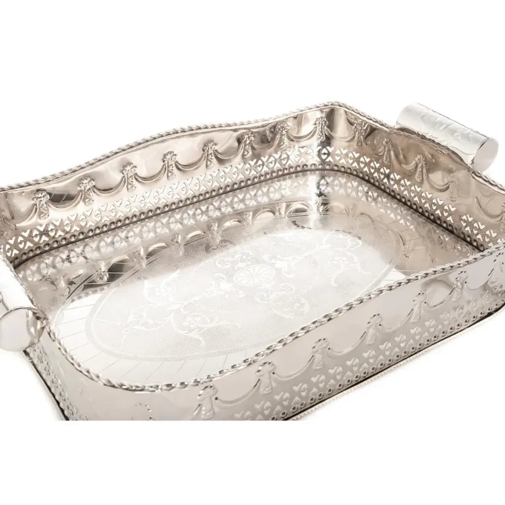 A reflective polished nickel tray with intricate cutouts and embossing is certain to add a stunning decorative layer to a display. From a living space to bathroom, any room can benefit from this beauty. It is a terrific option for a bar set up on a buffet or kitchen island.