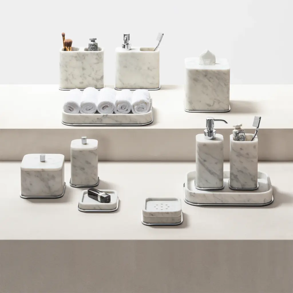 The Polo marble bathroom collection features the iconic silhouette with rounded corners, which is characteristic of the Polo family of creations, one of the brand's cornerstones, adding a gentle touch to each piece while denoting a taste for the minimal and the geometric. Every stone used to bring a Polo marble set to life is different from the other, providing a unique, exclusive design to each creation. Marble structure with brass base frame. Non-slip waterproof rubber base underneath.