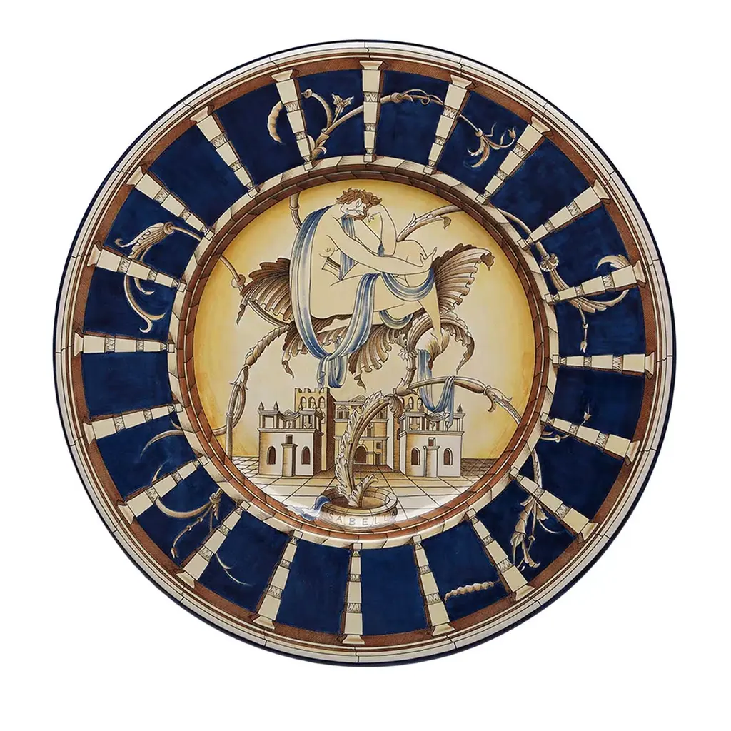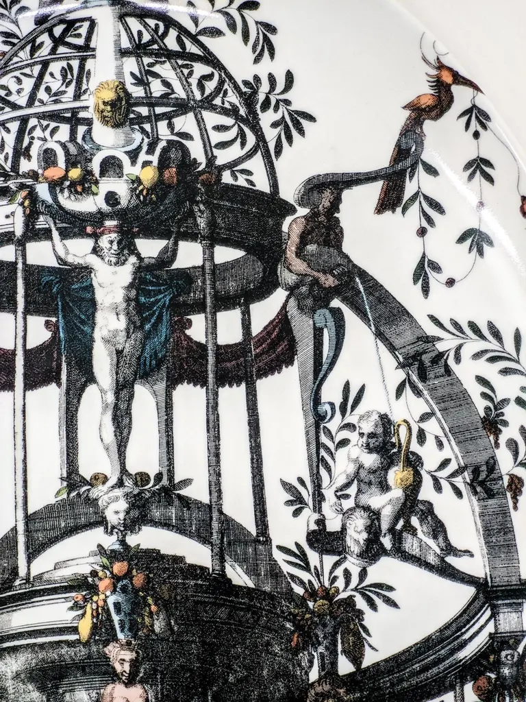 This 28x38cm oval tray is part of Pompei collection by Grand Tour by Vito Nesta. The classic and versatile shape is a must-have inside any home to embellish a table or beautify a wall. This tray is embellished with an ancient grotesque design. The intricate interweaving of architecture, mythological figures and branches is made more interesting through spot coloring interventions.