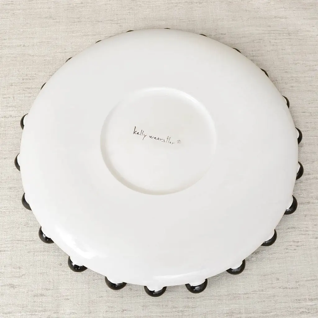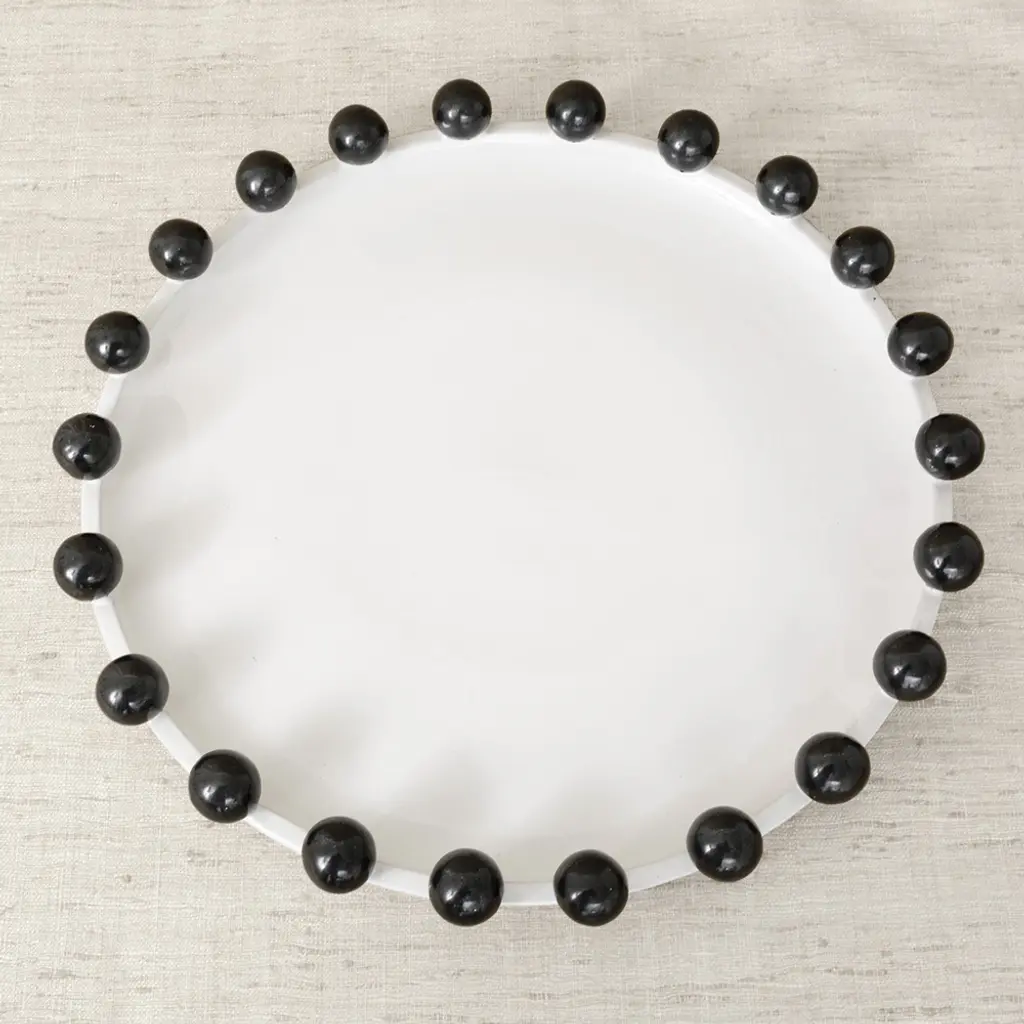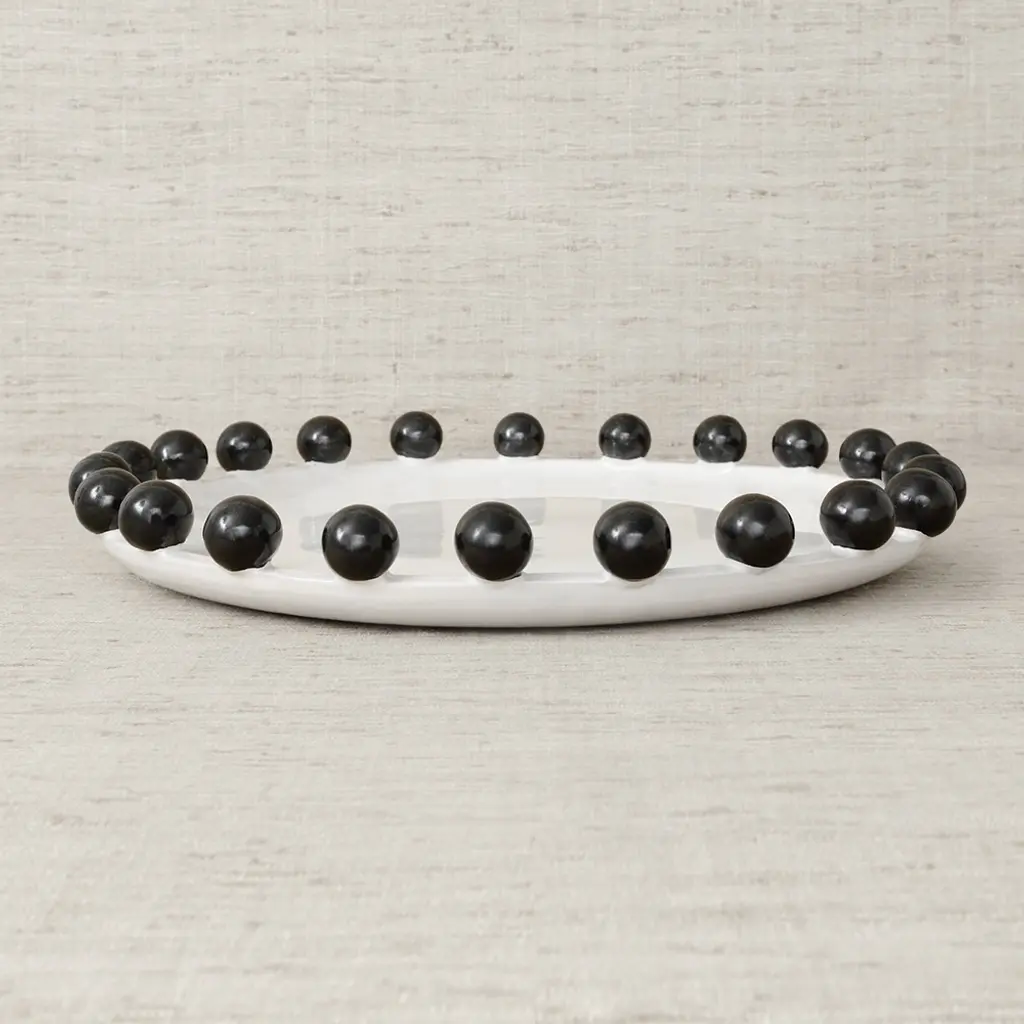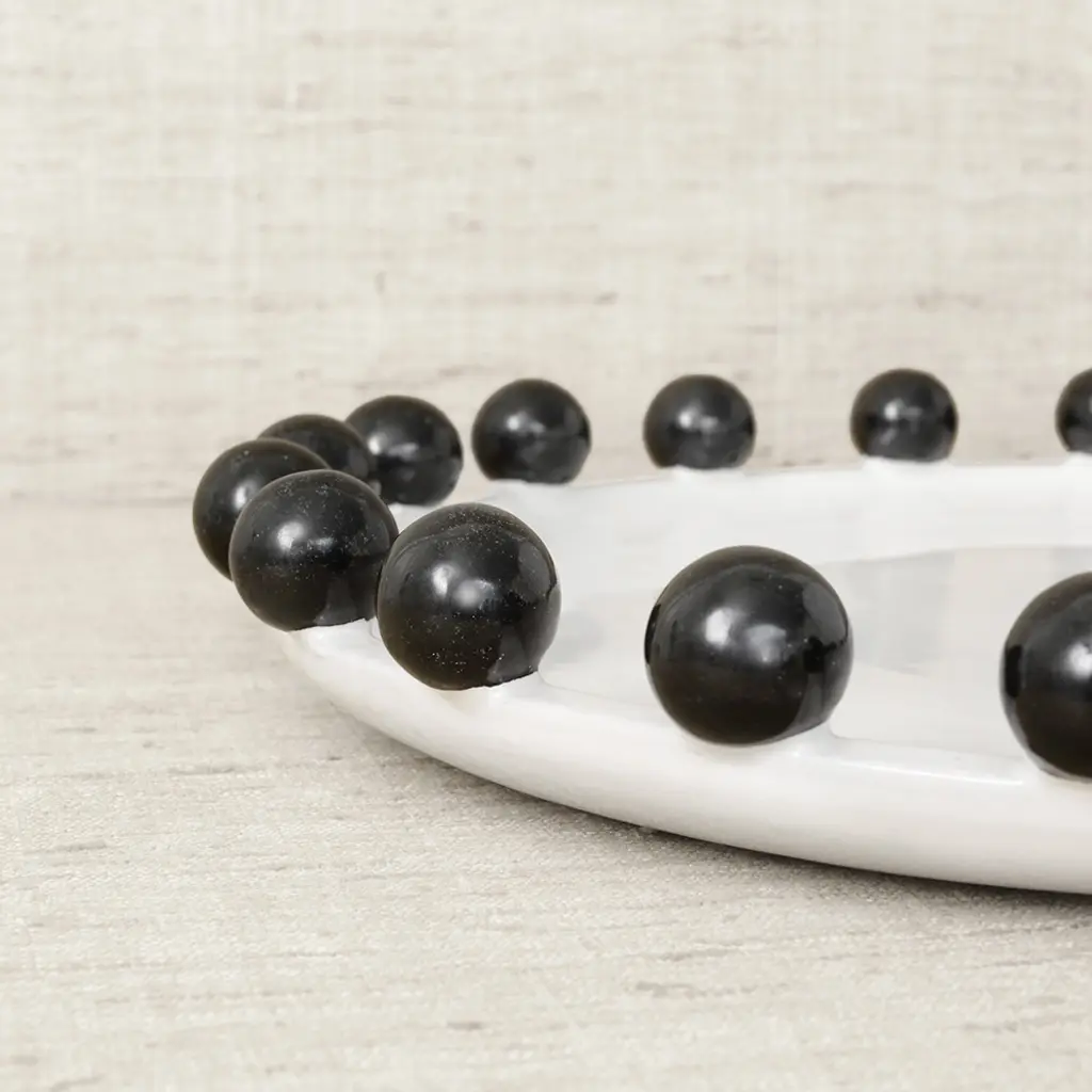 This is a unique white large ceramic platter with generous ebony decorative spheres used as exciting detail along the edges. Made to nest with the other pop platters from the Noir and Blanc collection but also works as a stand alone piece. A fresh centerpiece for a coffee table, vanity or dining table.