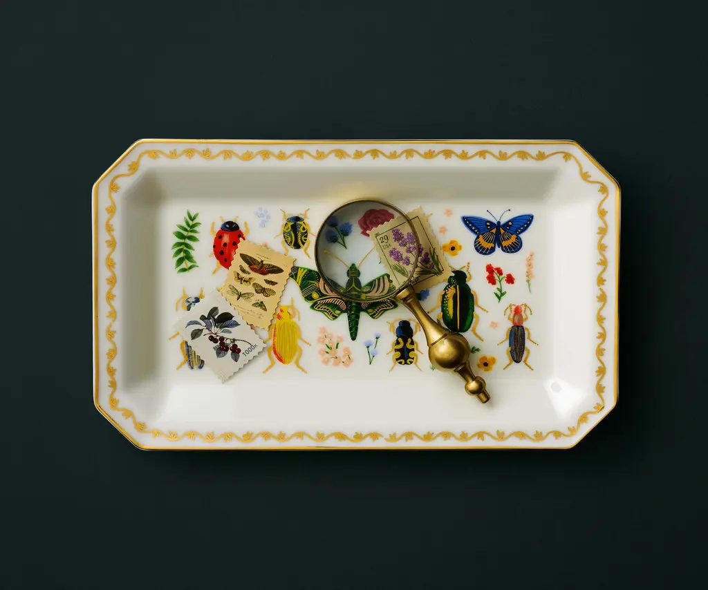 Keep track of all your trinkets with our large catchall tray, perfect for collecting mail, keys, or jewelry. This dish features the beetles, bugs, and flowers of our Curio print, with gold accents and a gilded rim for extra shine.