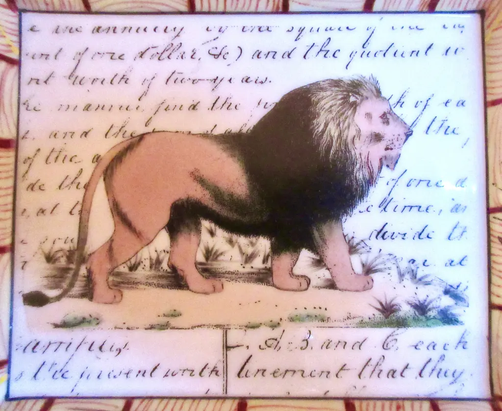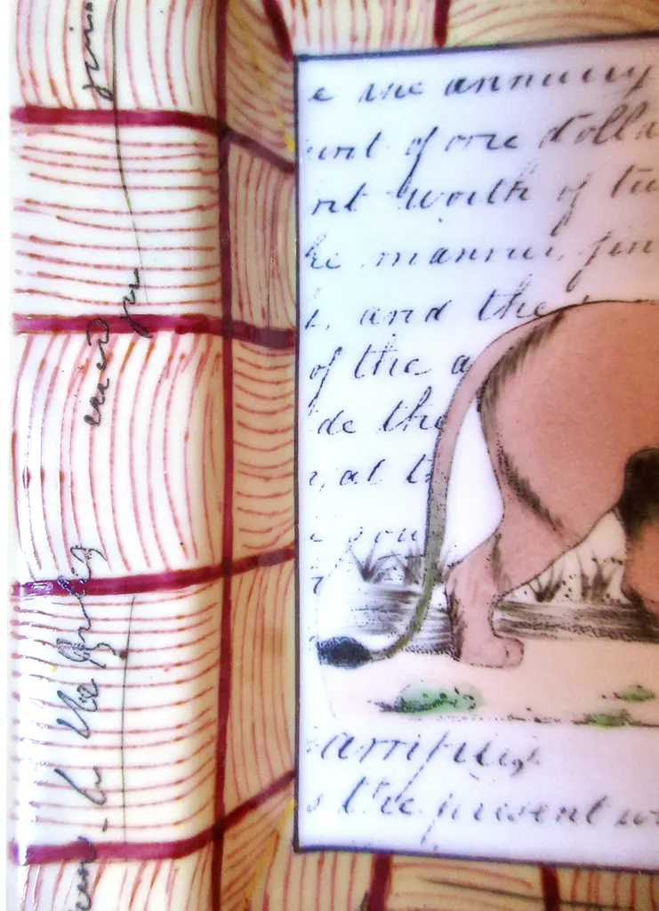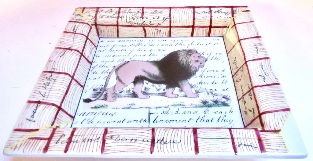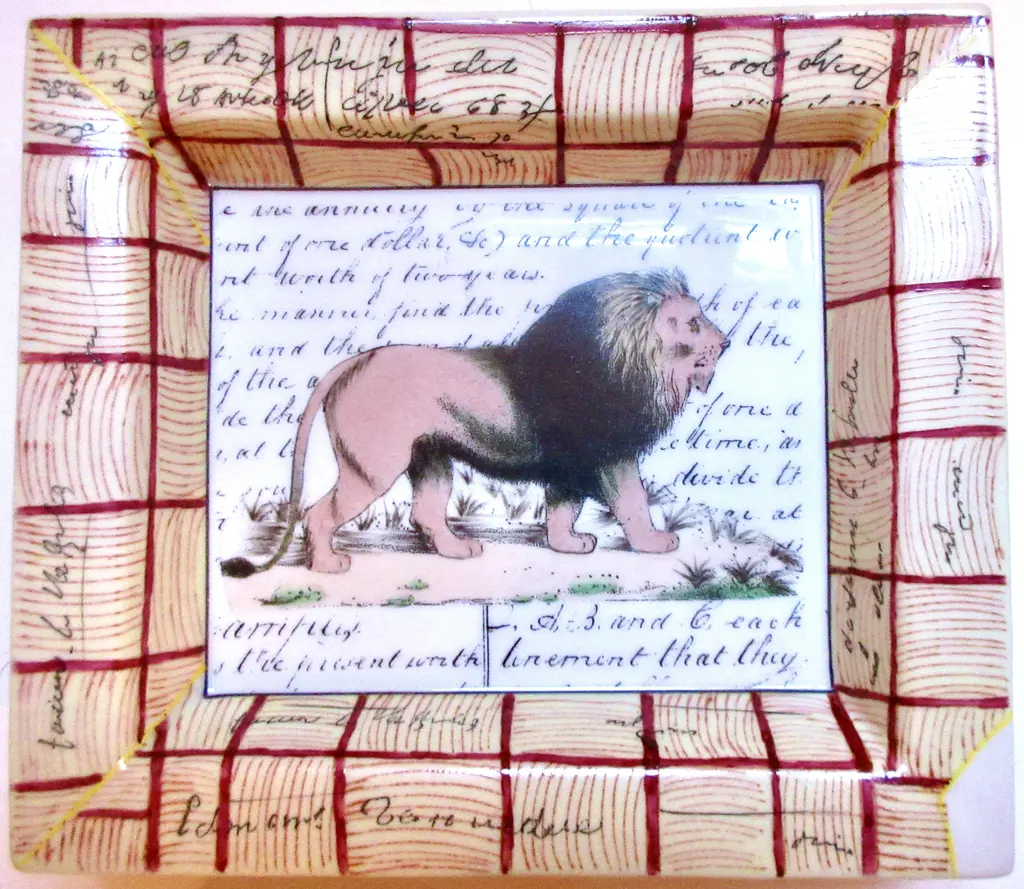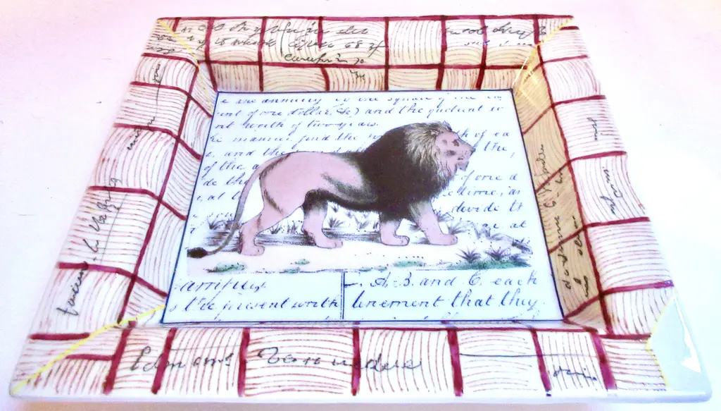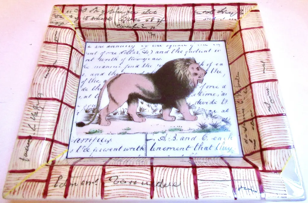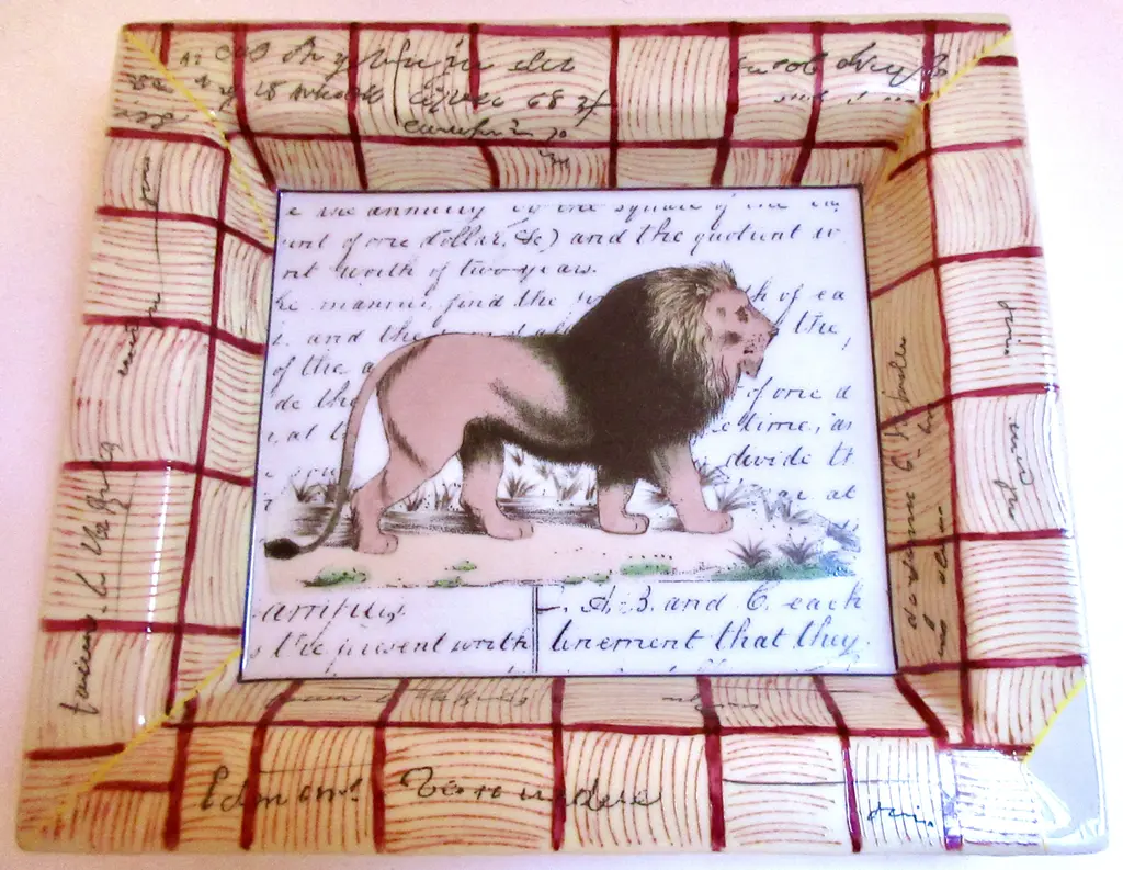 Hand-painted porcelain tray featuring a regal lion against a background of calligraphy, with tattersall border decoration. Marked "John Derian New York Peint a la Main."