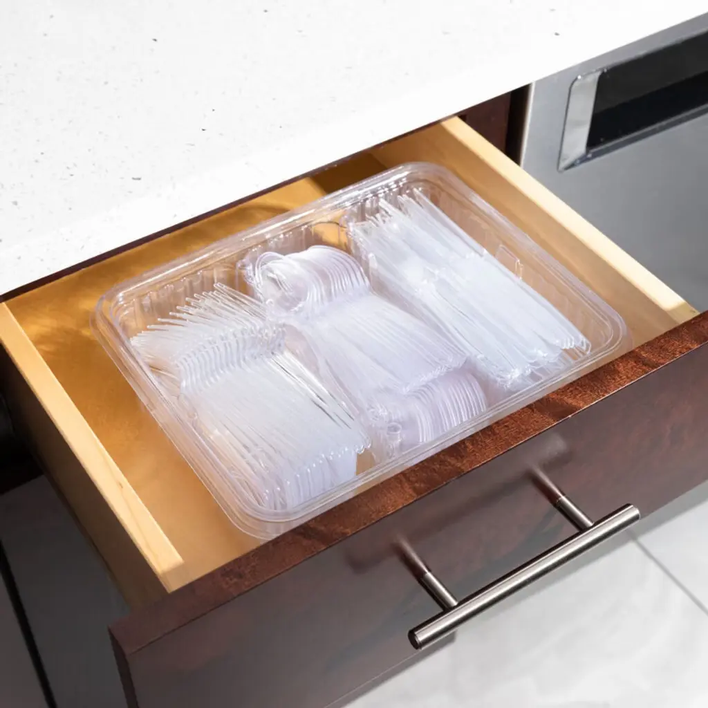 Stay organized and ready for any occasion with our Clear Plastic Cutlery Sectional Tray. Each tray comes pre-filled with 240 pieces of cutlery, neatly arranged in compartments for easy access and clean storage. Whether you're setting up for a buffet, holiday, events, or simply restocking your kitchen drawer, this all-in-one cutlery solution combines practicality with convenience. Just open and place the tray in your drawer or on the buffet table—no sorting or repacking required. Product Details Product Type: Cutlery-Filled Sectional Tray Color: Clear Tray Style: 3-Section Material: Plastic Includes: 240 total pieces 100 Forks, 100 Teaspoons, 40 Knives Occasion: Great for home storage, Shabbos, Yom Tov, events, and everyday use