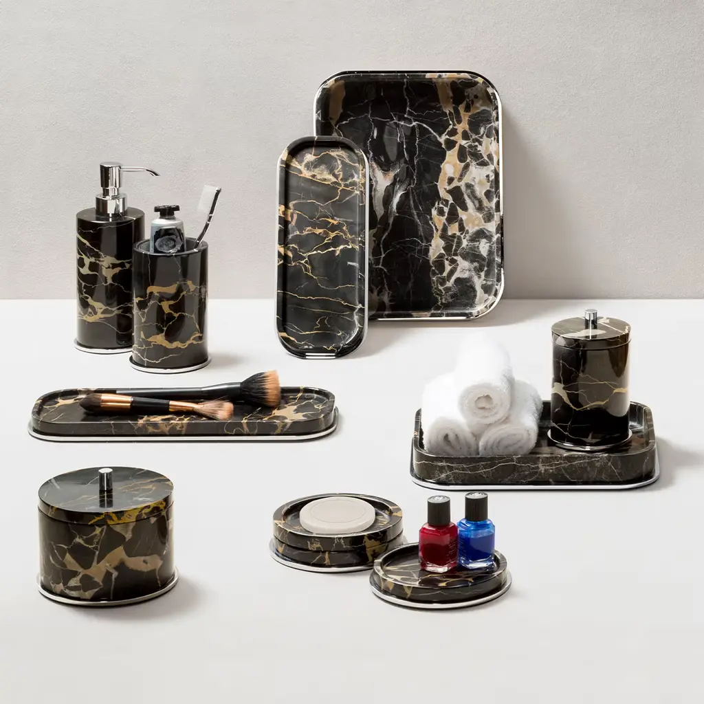 The Positano marble valet tray and soap bowl boast metal details with different finishes -brushed bronze, brushed brass, and polished chrome- that enhance each piece. Every stone used to bring a Positano marble set to life is different from the other, providing a unique, exclusive design to each creation. Marble structure with metal base frame. Non-slip waterproof rubber base underneath. Marble finishes available arabescato white / green guatemala / bramosa brown / black portoro / travertino.