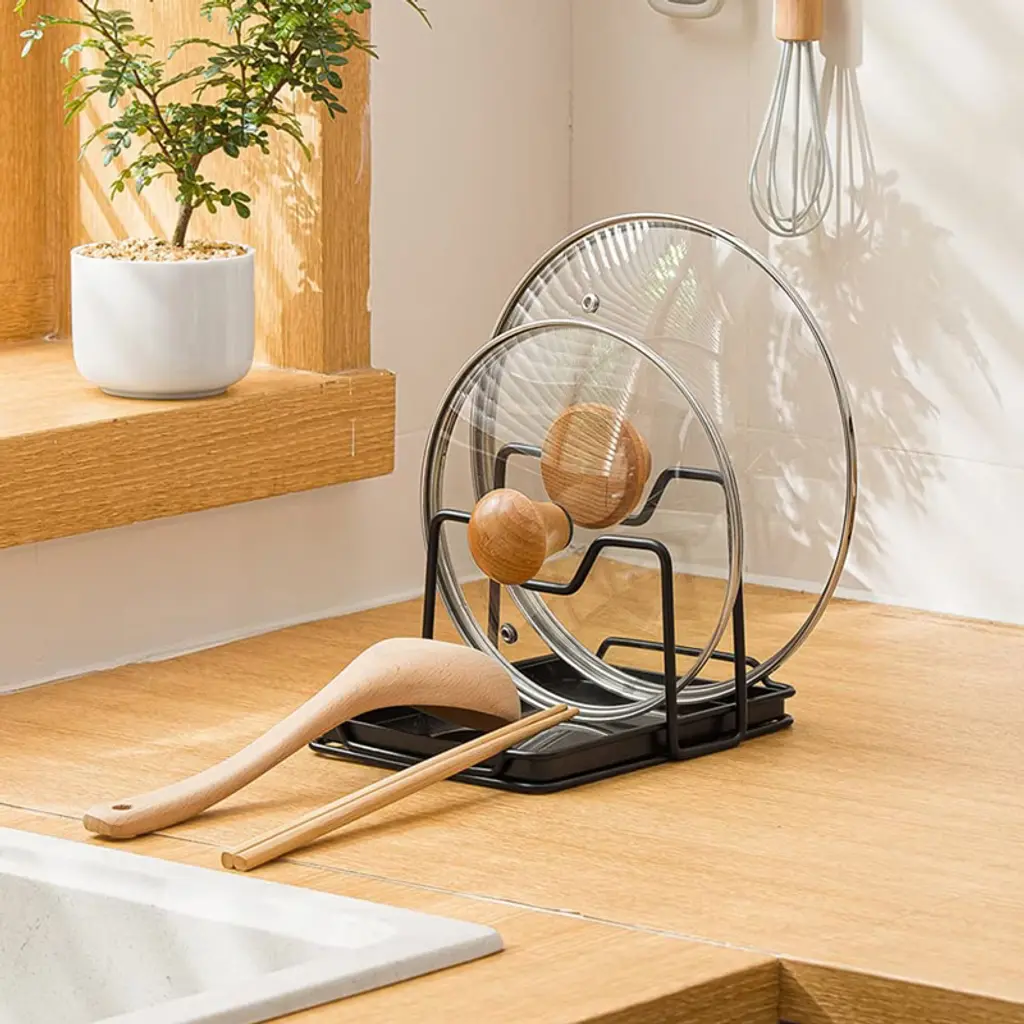 2 in 1 Unique Design - This cutting board organizer rack is great for small space, you can use it on your kitchen counters, in the cabinets, under sink cabinets, pantry. Simple and elegant U-shaped rack can vertically fix pot lids, the lids will not easily fall off; Also you can put other kitchen utensils on the drainage tray to save space and keep everything neat. Save space and Practical - 2 layers with U-shape hold firmly lids for not slipping, the drainage tray can collecting drip on lids, without worrying about dirtying the countertop. Flexible and Multi-Use - Provides a resting spot for wet drippy pot lids of different sizes, A great kitchen addition to hold most various pot lids, plates, cutting boards, spatulas, spoons and so on. Materials - Made of durable plastic(tray) and iron(body); Metal construction creates a solid and stable base, iron body is electrostatically coated to prevent rust; The soft curve and the sleek edges can effectively protects utensils from scratches. Easy to Clean - The drip tray of pot lid holder is removable to make cleanup a breeze, wash with running water and dry thoroughly then put it back on stand.