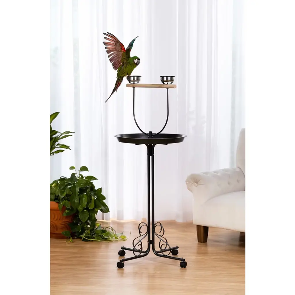 Prevue Pet Products Round Playstand/small 3185 is simple yet elegant playstand. Keep birds close to the action to help maintain their overall well-being mental health. This playstand on rolling casters moves easily from room to room and allows you to keep your favorite feathered friend close. This playstand includes a 1" diameter perch, 2 stainless cups and large debris tray. Suitable for conure, caique, amazon, African Grey and other small parrot. Overall measurements are 24 5/8" wheel base diameter, 56" High. Debris pan measures 21 3/4" diameter.