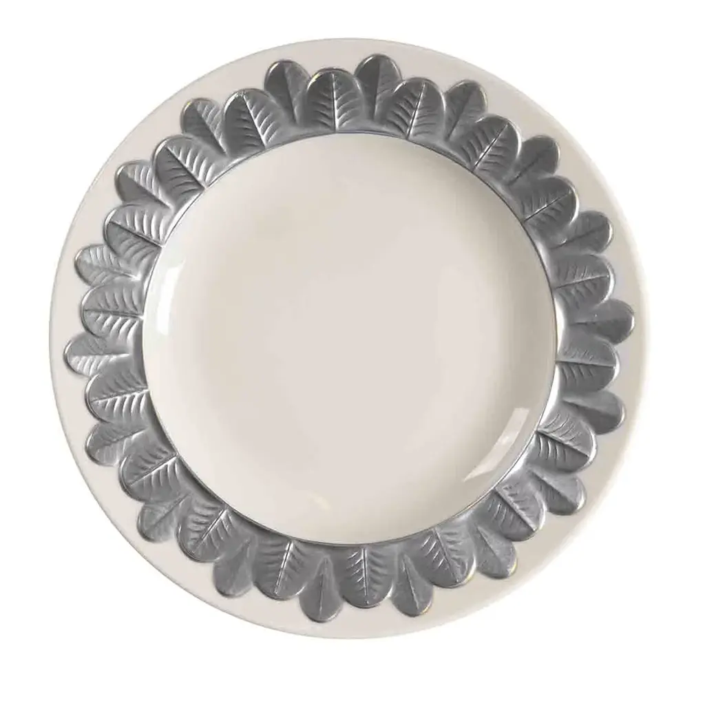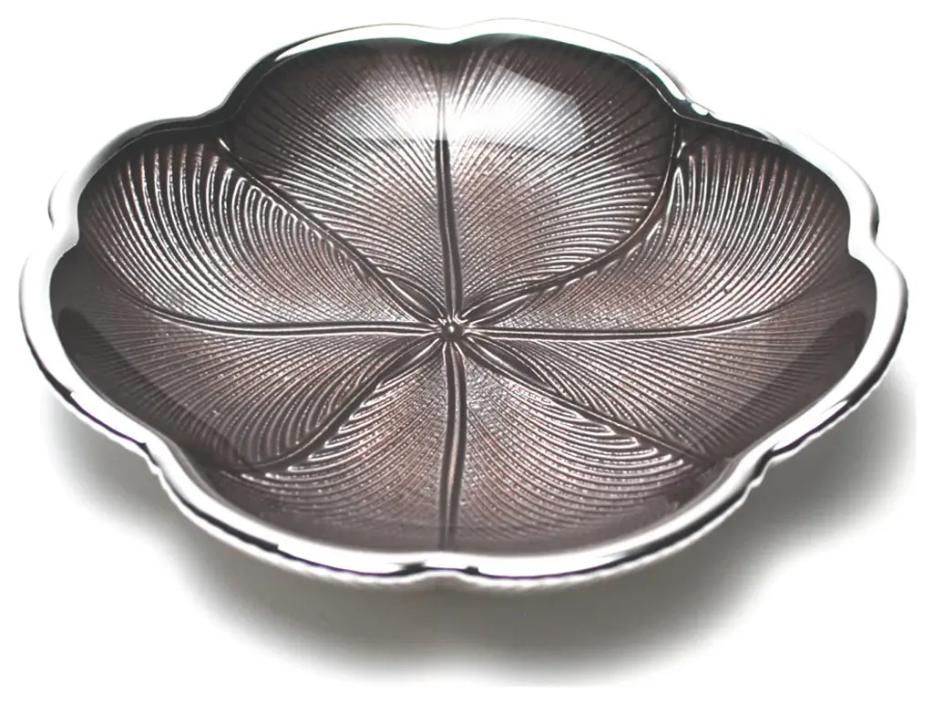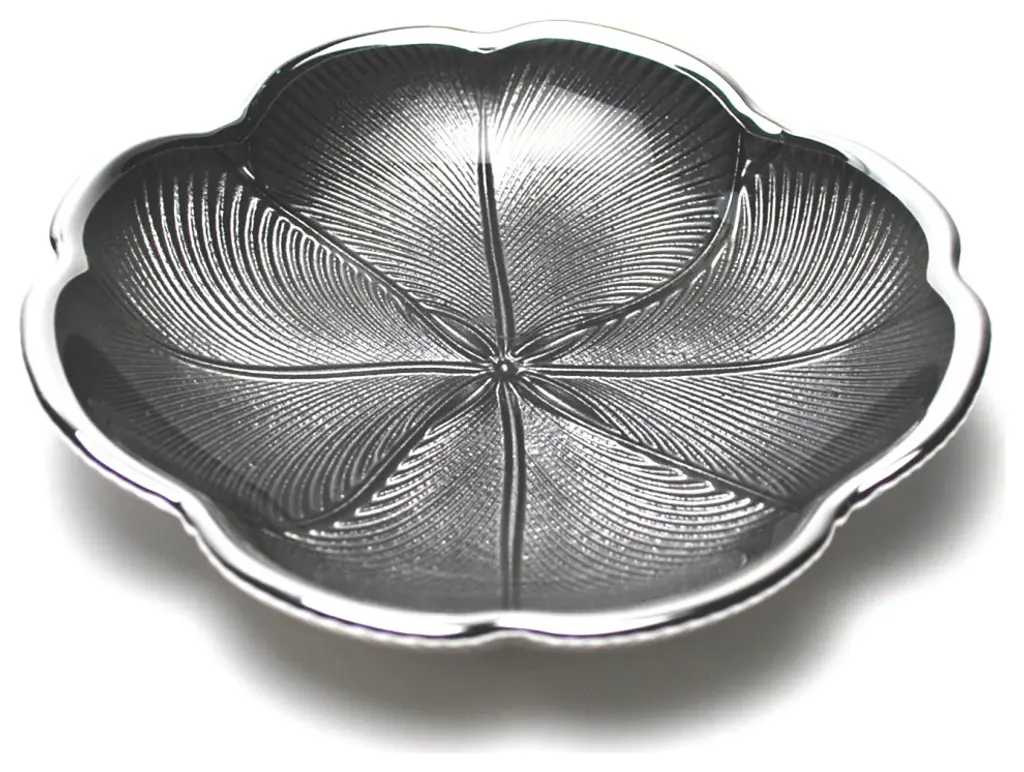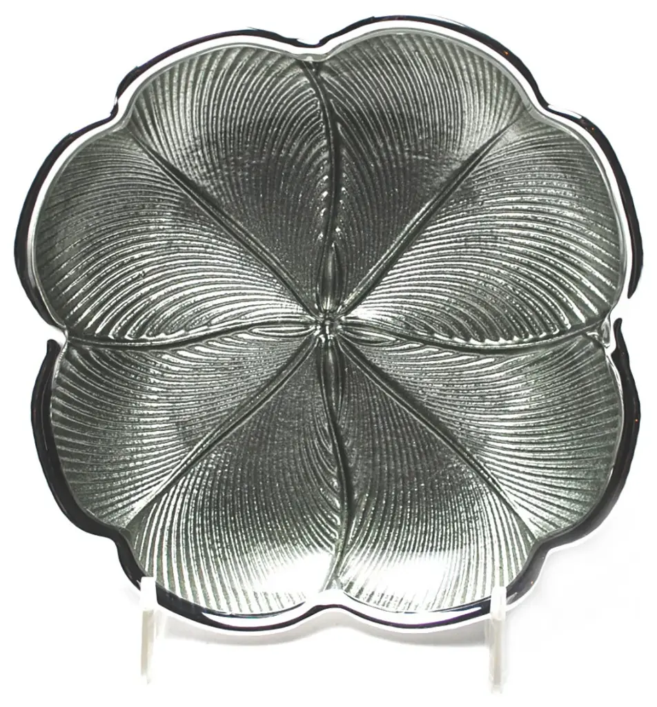The Quadrifoglio Tray, 6" Diameter, is created from Italian glass that is hand decorated in sage green and finished with a layer of pure silver applied to the outer surface of the glass that gives a luxury touch to your table and home. Exceptional Value with Elegant Style made in Italy. Professional packing for each item shipped from our U. S warehouse. As each piece is handcrafted no two pieces are exactly alike and slight variations in color and size may occur.Quadrifoglio Tray Sage Green Silver 6"� Dia.Made in ItalyExceptional Value and Elegant StyleAs each piece is handcrafted no two pieces are exactly alike and slight variations in color and size may occur.