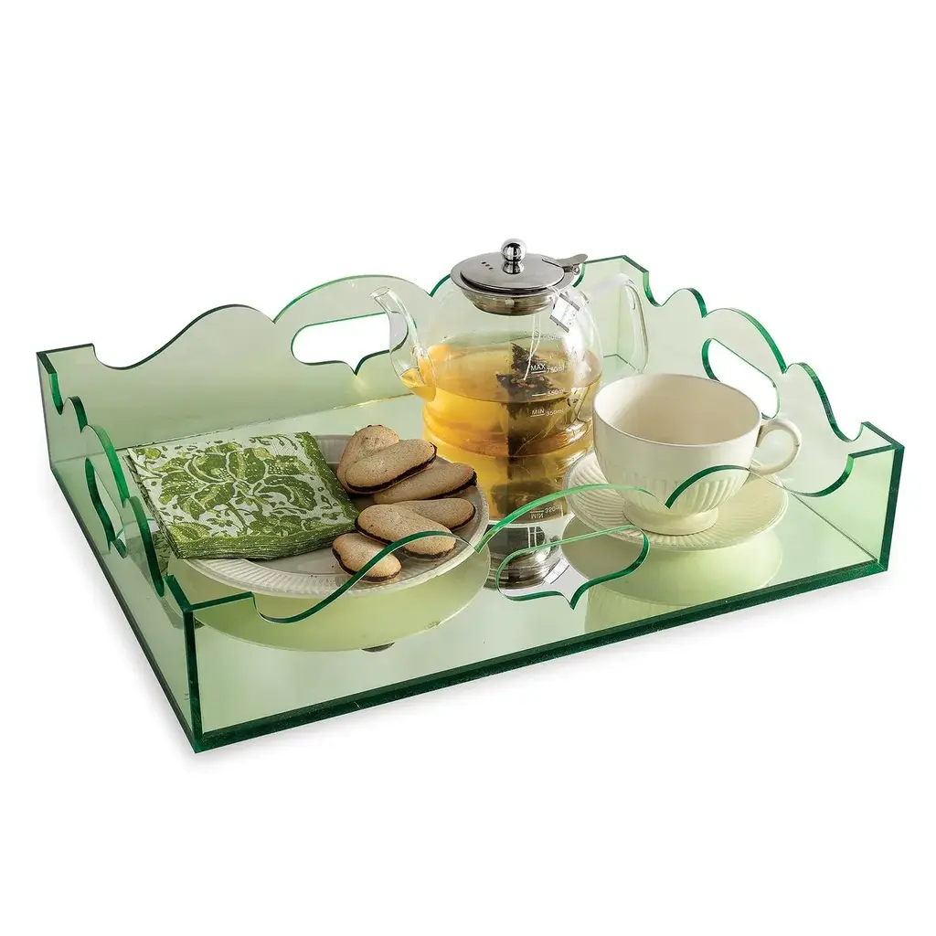 Gracious and dramatic. The queen anne tray is the perfect serving tray for cocktails or nibbles. The mirrored bottom offers a bright reflection against the translucent lucite curved frame of the tray. Velvet bottom for protection. The tray is offered in clear, translucent green and blue. Measurements: 4"H x 18"W x 14"D. Materials: acrylic, mirror Indoor use only. Clean with soft dry cloth