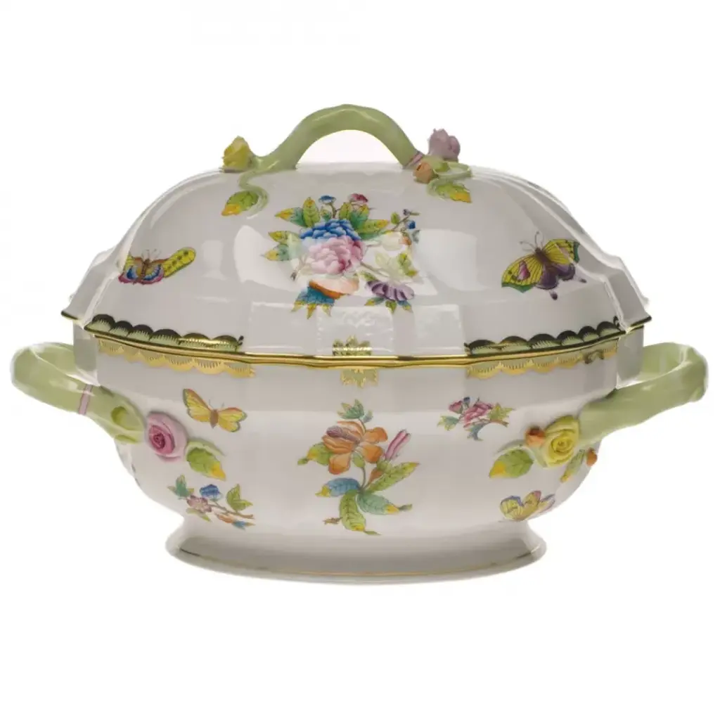 The original set, introduced in 1851 at the First World Exhibition in London, was purchased by Queen Victoria herself. Subsequently named for her, this Chinese-influenced pattern demands the skills of Herend's most talented and experienced painters. Hand painted in Hungary. Now the biggest porcelain manufactory in Europe, Herend was founded in 1826 to produce earthenware in the small Hungarian village for which it was named. At the time, Hungary was flooded with low-cost pottery, but in 1839, Mor Fischer became the Manufactory’s new owner and he decided to focus on producing dinnerware replacement pieces for Europe’s royal families to complement their valuable porcelain patterns from Germany and the Far East. As his client base grew, Fischer commissioned his artists to begin designing dinnerware patterns of their own. Queen Victoria’s 1851 purchase of a large set for Windsor Castle was a milestone, setting the stage for aristocrats throughout Europe to clamor for Herend in their estates. In the 1850s, Herend added meticulously-crafted figurines to its creations. Herend’s trademark fishnet pattern, which is widely recognized and prized as Herend’s signature design, started in 1858 when an artist who was intrigued with a Chinese plate’s fish scale design painted it onto a rooster figurine to imitate feathers.