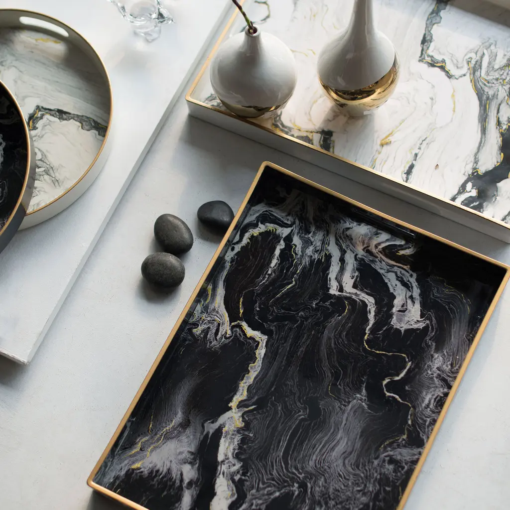This set of 2 Quinn rectangular decorative trays has the luxurious look of natural stone with none of the weight. One black and one white tray have a realistic marble pattern but are actually made out of plastic. They come in two different sizes to accommodate a variety of carrying and display needs.