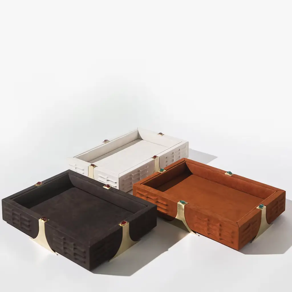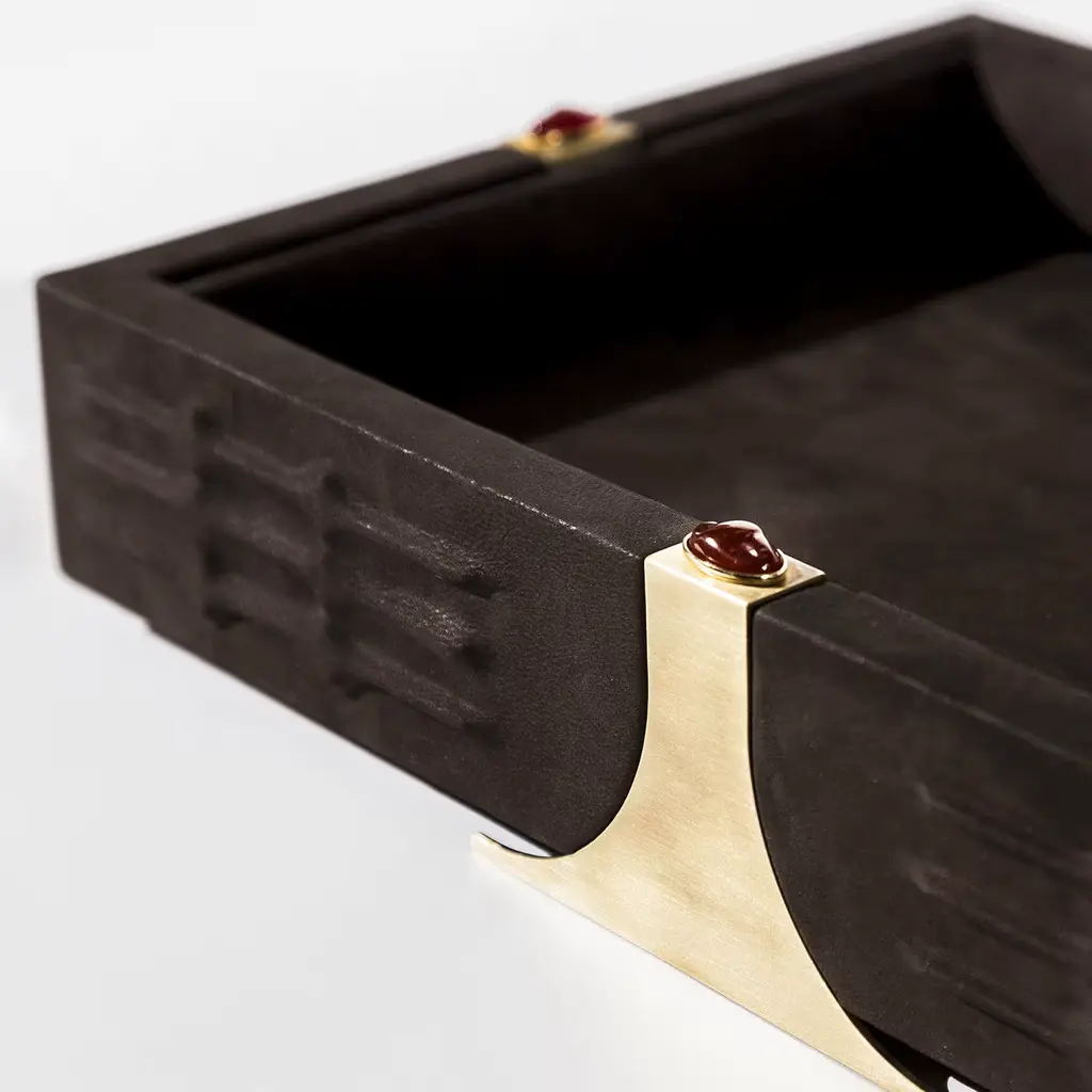 Drawing inspiration from Oscar Niemeyer’s bold brutalist architecture, the RABAN Tray combines imposing lines with poetic sensuality. Crafted in solid wood and wrapped in luxurious brown Nabuck leather, it features textured sides accented by elegant brass inserts. Vibrant Red Corniola stones provide a striking contrast. Also available in other colors, with green agate stones, and in a square version. Contact the Concierge for further details.