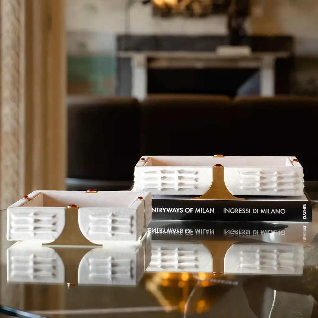 Drawing inspiration from Oscar Niemeyer’s bold brutalist architecture, the RABAN Tray combines imposing lines with poetic sensuality. Crafted in solid wood and wrapped in luxurious white Nabuck leather, it features textured sides accented by elegant brass inserts. Vibrant Red Corniola stones provide a striking contrast. Also available in other colors, with green agate stones, and in a square version. Contact the Concierge for further details.