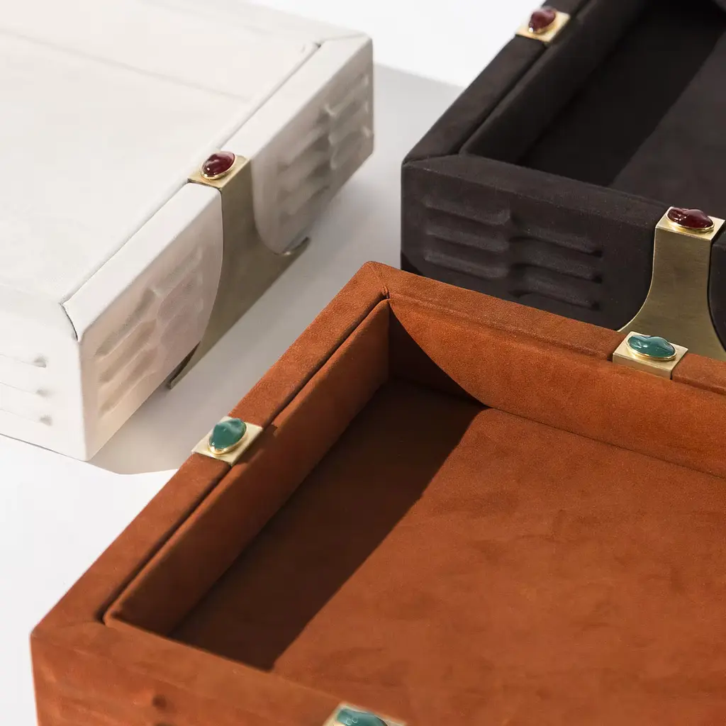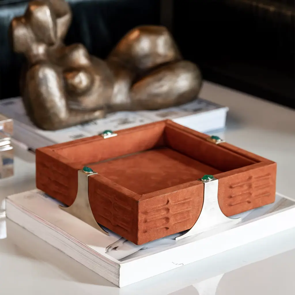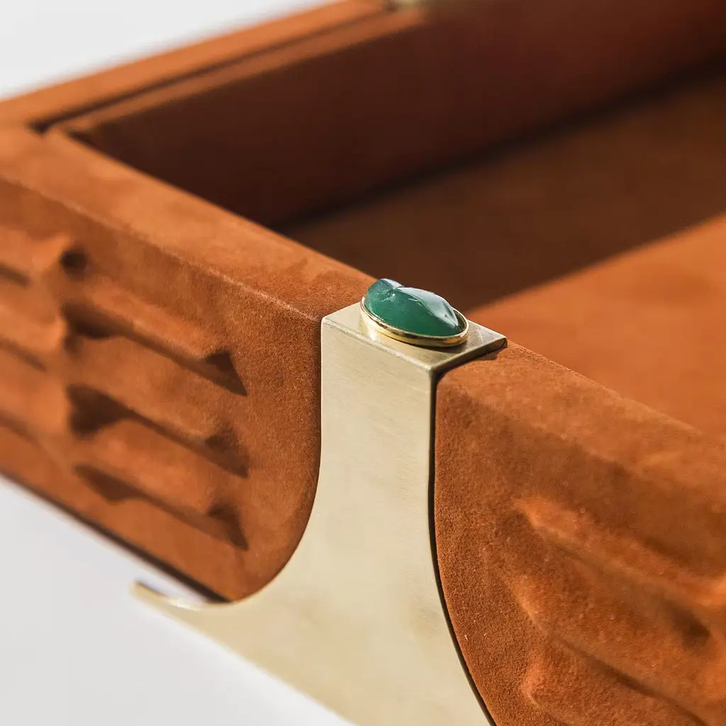 Drawing inspiration from Oscar Niemeyer’s bold brutalist architecture, the RABAN Tray combines imposing lines with poetic sensuality. Crafted in solid wood and wrapped in luxurious orange Nabuck leather, it features textured sides accented by elegant brass inserts. Vibrant green agate stones provide a striking contrast. Also available in other colors, with Red Corniola, and in a rectangular version. Contact the Concierge for further details.