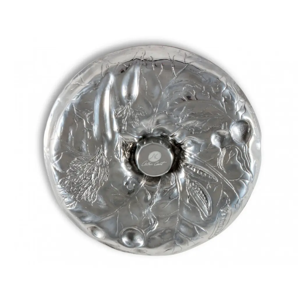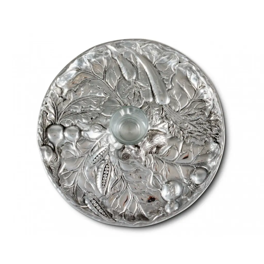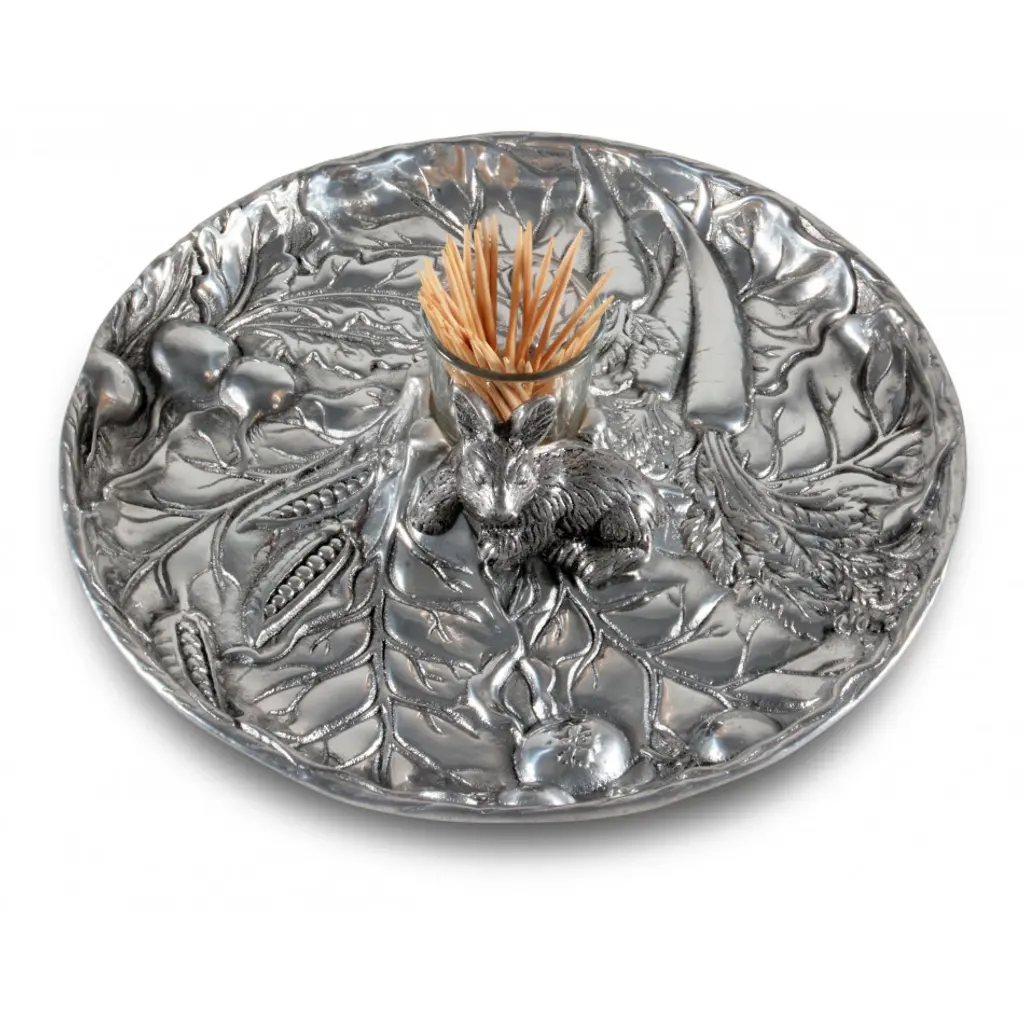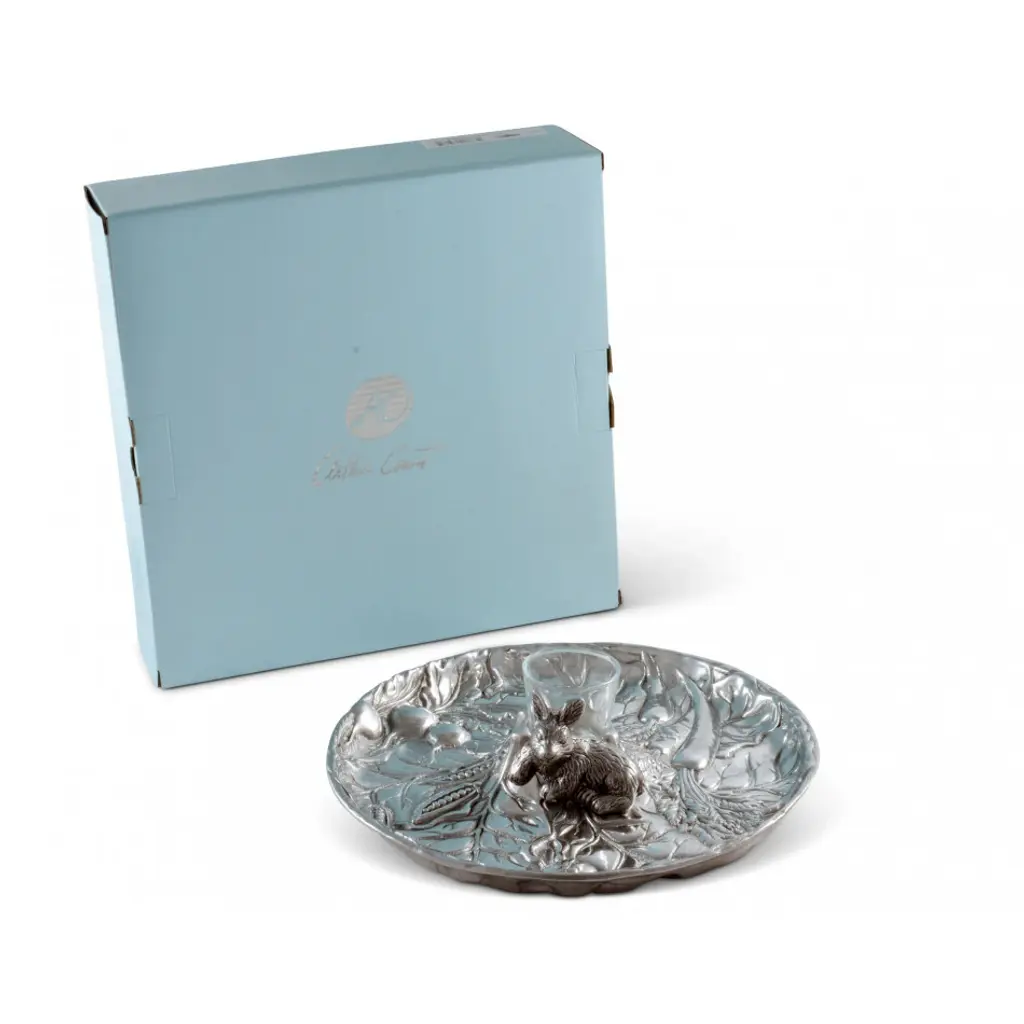 A sweet, Arthur Court Bunny rests on a bed of cabbage leaves surrounded by garden delights creating the Arthur Court Rabbit Garden Tidbit Tray. Bas-relief design includes carrots, pea pods, tomatoes and radishes, the resting bunny figure in the middle. Featuring a votive-sized glass holder in the middle, this tray is a stunning way to serve an assortment of crudités, (with carrots of course), nuts, candies or any tidbit collection. The glass holder in the middle will hold picks, hors d'oeuvres forks or even a tealight candle.