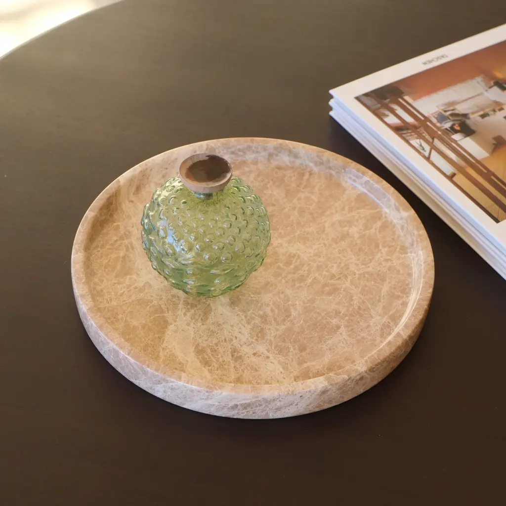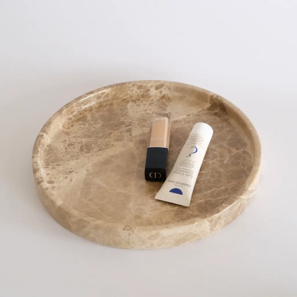 Elevate your home decor with the Raya Marble Tray in Light Emperador. This exquisite round tray features a unique marble type with a neutral color palette and intricate veining, adding a sophisticated touch to any living space. Its smooth, polished surface is ideal for showcasing your favorite decorative items, while the durable construction ensures long-lasting beauty. Perfect as a centerpiece, the Raya Marble Tray combines elegance and functionality, impressing guests and enhancing the overall aesthetic of your home.