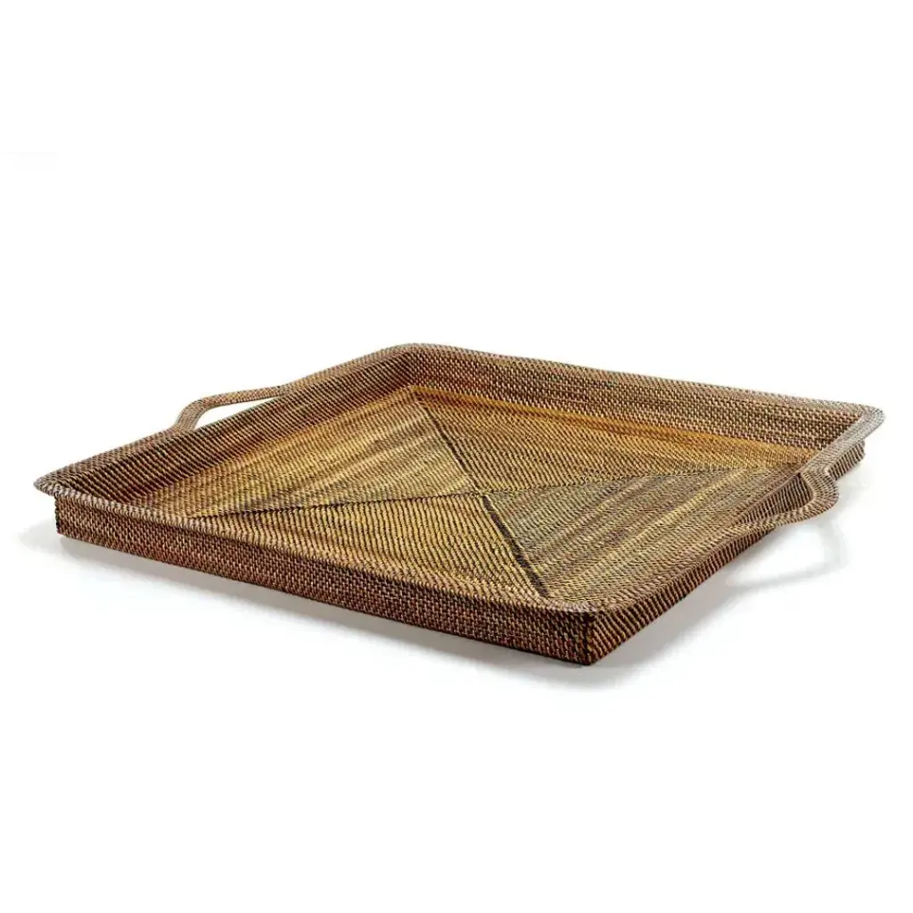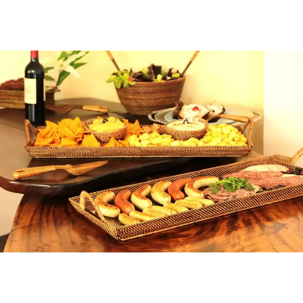 This rectangular tray is beautifully crafted and perfect for displaying your favorite charcuterie and cheese delicacies. Reinforced with wrought iron for durability and to support heavier presentations, its removable clear glass bottom creates an eye-catching appetizer presentation, while the earthy rustic tone of the serving tray made from natural exotic vines complements the colors of your food display, making it appear more appetizing.