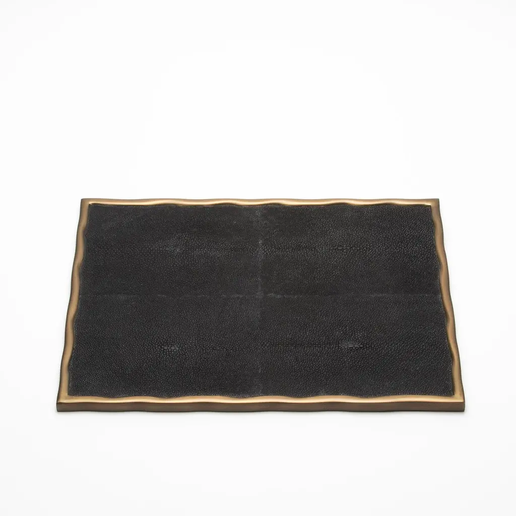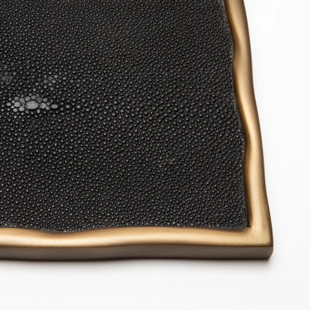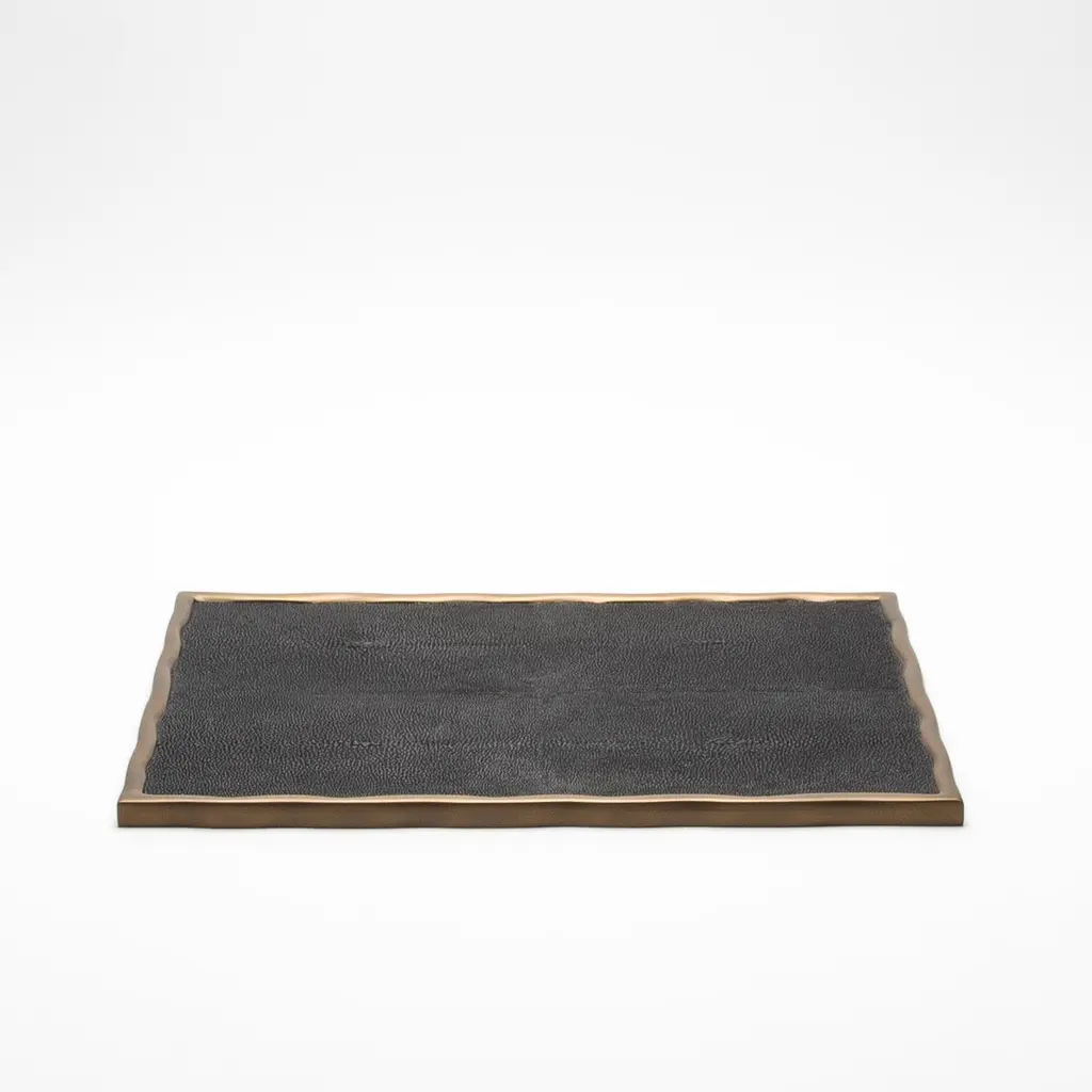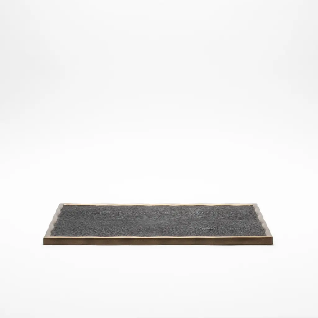 The Rectangular Melting Tray by R&Y Augousti in white shagreen exudes refined sophistication and meticulous craftsmanship. Encased in bronze patina brass with an organically flowing melting border, this tray merges timeless elegance with modern artistry. The shagreen's subtle texture paired with the brass frame creates a luxurious contrast, offering both aesthetic appeal and functional grace. Ideal for elevating a space with understated opulence, this hand-crafted piece is a testament to impeccable design and unparalleled artisanship.Available in other finishes, shapes and sizes.This item is on display in our LA showroomColor variants may occur on the stingray and other exotic finishesClean with soft dry clothAbout R&Y AUGOUSTI:R&Y Augousti, created by the visionary husband-and-wife duo Ria and Yiouri Augousti, epitomizes the pinnacle of luxurious, globally inspired design. Since its inception in Paris in 1989, the brand has become synonymous with opulence, distinguishing itself through the masterful integration of shagreen with brass and other exotic materials. Each piece in their Art Deco-inspired collection is a testament to unparalleled craftsmanship, meticulously handcrafted by the finest artisans in the Philippines, ensuring that every creation is a unique masterpiece.Ria, hailing from Manila, and Yiouri, from Cyprus, share an exquisite passion for revivalist design, which has propelled R&Y Augousti to the forefront of luxury interiors. Their innovative use of materials, particularly the revival of shagreen, has set new standards in elegance and sophistication. The natural color variations on stingray and other exotic finishes further enhance the authenticity and bespoke nature of their designs.Today, R&Y Augousti’s collections grace the most exclusive showrooms in Paris, New York, and Los Angeles at the Pacific Design Center's MOGUL, continuing to redefine the essence of timeless luxury. Their work is not merely furniture; it is a celebration of art, craftsmanship, and the ultimate in refined living.