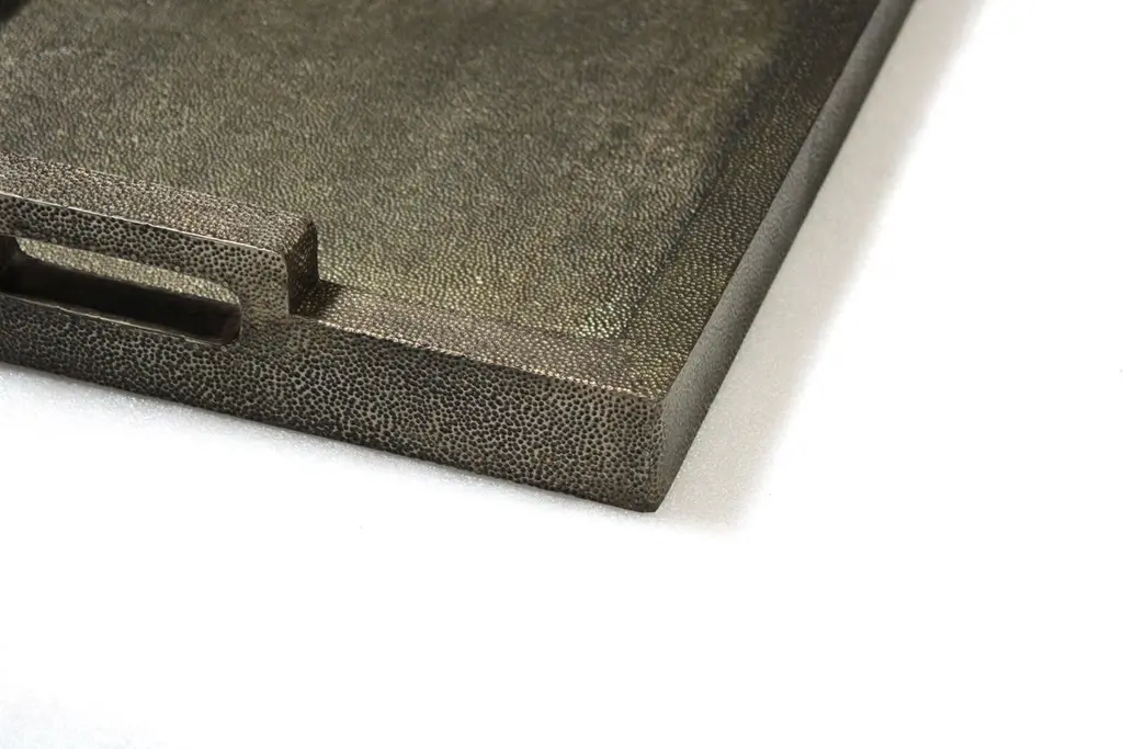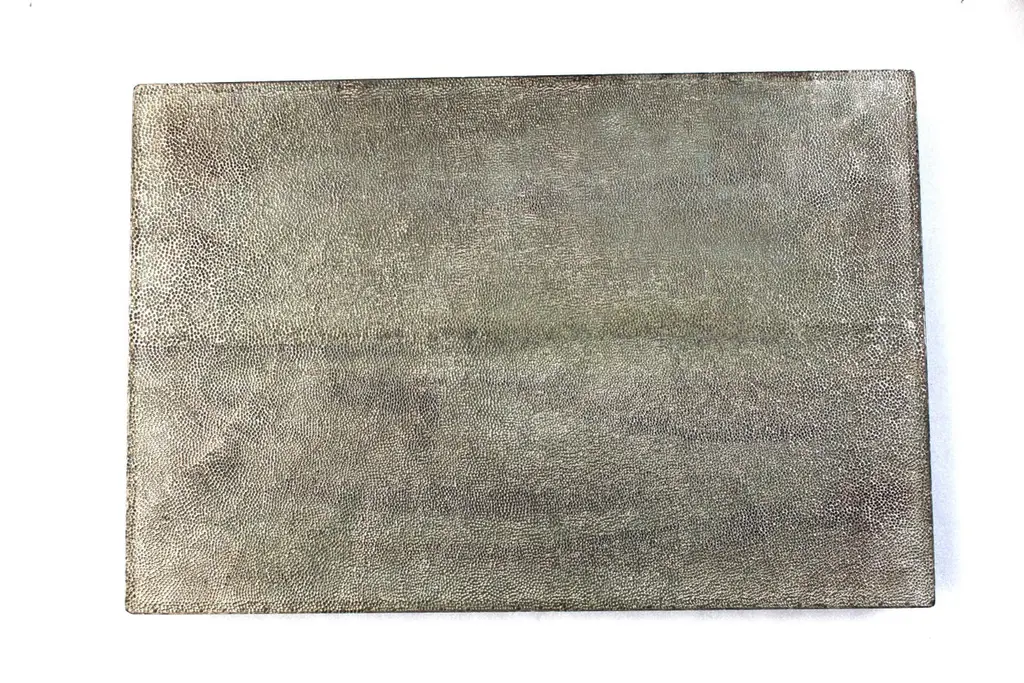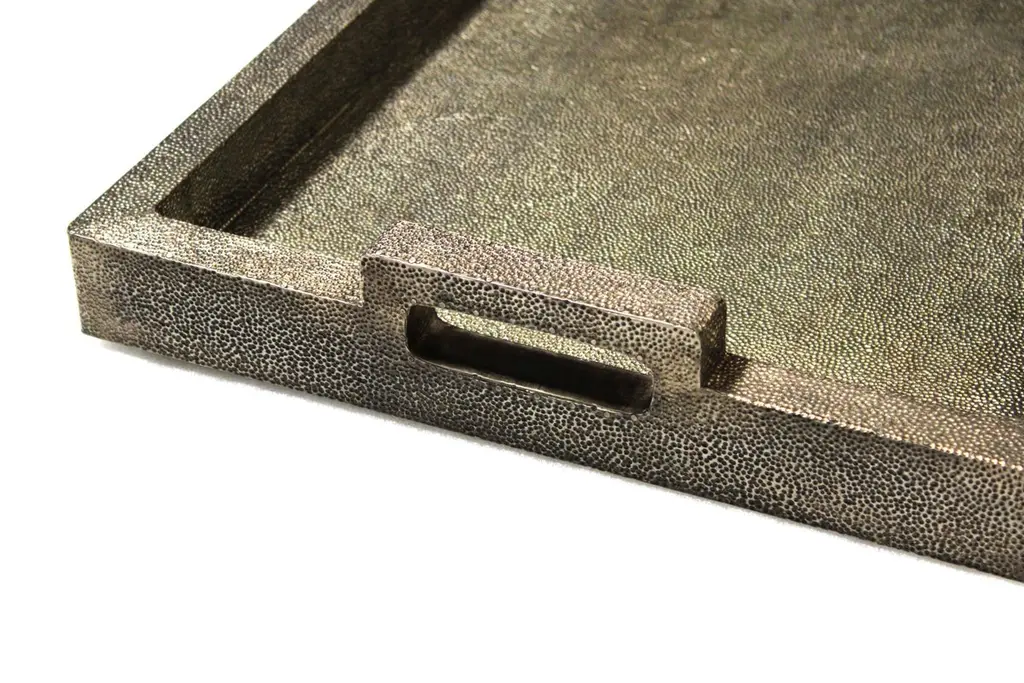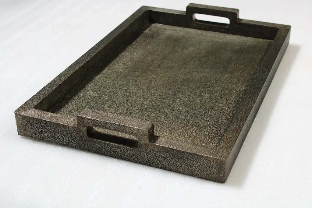 Minimal and versatile, this tray is made in high quality waterproof engineered wood which is clad in metal using the traditional artisanal technique. The metal clad exterior is then followed by meticulous hand hammering giving it this unique finish. Rectangular Metal Clad Tray in Antique BronzeSize- 24.5" x 16.5" x 02" HMaterials - Antique Bronze, Teak, Hammered, Hand-CarvedPlease note that moisture in air, sudden change in temperature and natural movement of wood over time causes the metal to wrinkle or bubble up. We use well seasoned, reclaimed teak and high quality marine grade MDF (wherever technically possible) to avoid and delay the above mentioned changes. However a perfect stability of metal cannot be guaranteed.Buyer Cancellation-The cancellation charge is 25% which increases to 50% if the production is started.Prices do not include shipping from India (for custom orders) or our MN warehouse (items from stock). That will be additional.