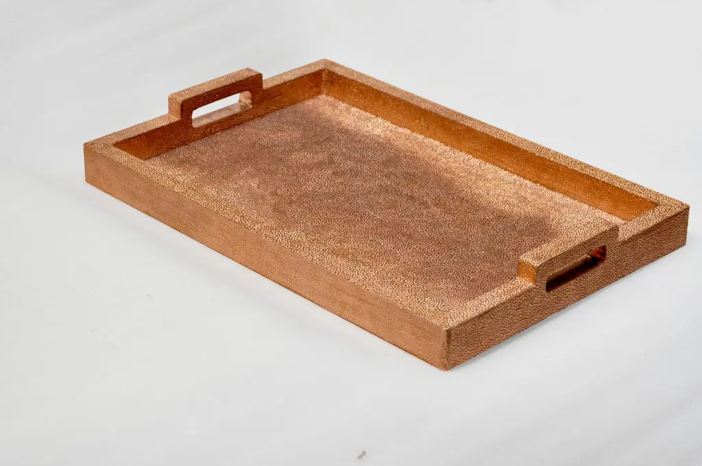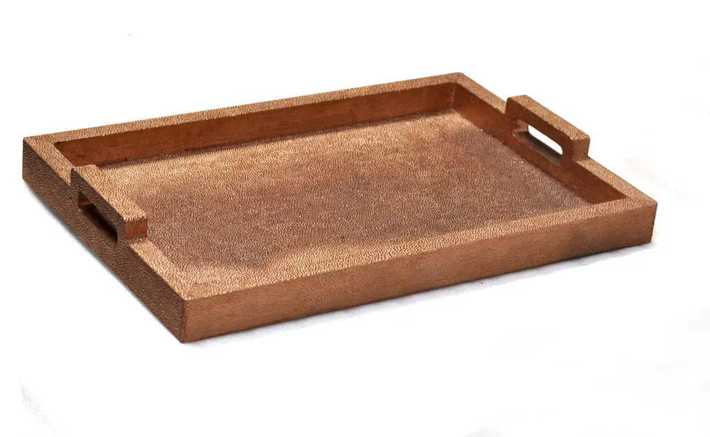 Available size:24.5" x 16.5" x 02" HMinimal and versatile, this tray is made in high quality waterproof engineered wood which is clad in metal using the traditional artisanal technique. The metal clad exterior is then followed by meticulous hand hammering giving it this unique finish.Please note that moisture in air, sudden change in temperature and natural movement of wood over time causes the metal to wrinkle or bubble up. We use well seasoned, reclaimed teak and high quality marine grade MDF (wherever technically possible) to avoid and delay the above mentioned changes. However a perfect stability of metal cannot be guaranteed.Customization is our specialty.Prices do not include shipping from India (for custom orders) or our MN warehouse (items from stock). That will be additional.