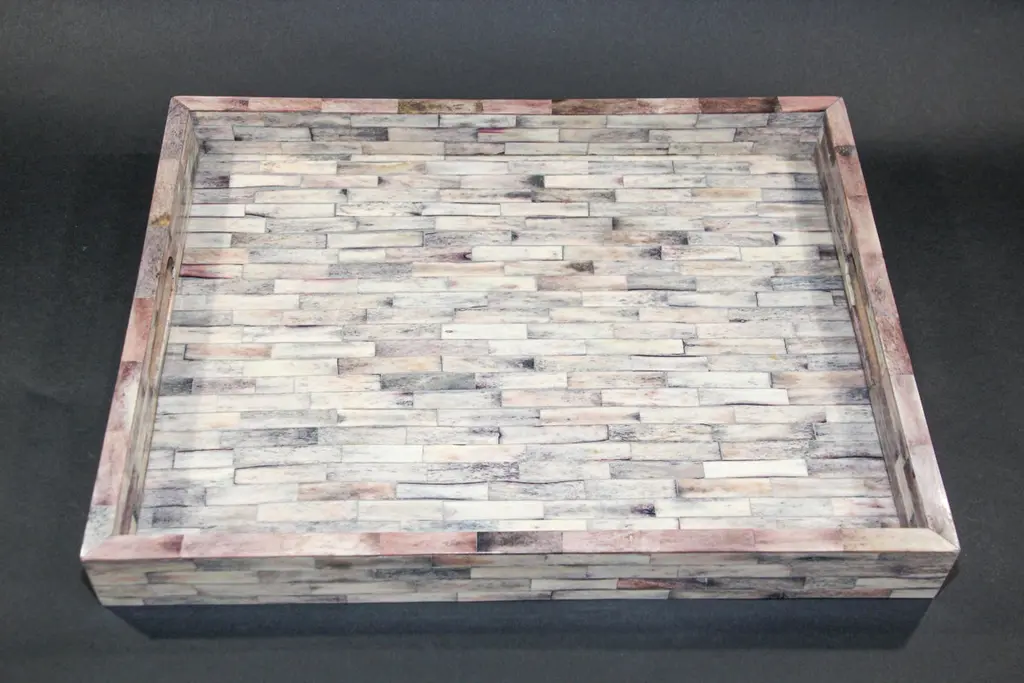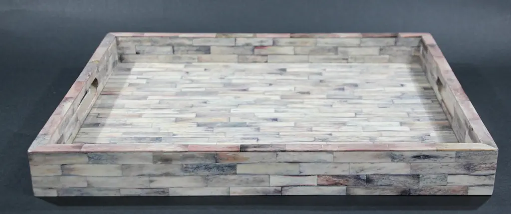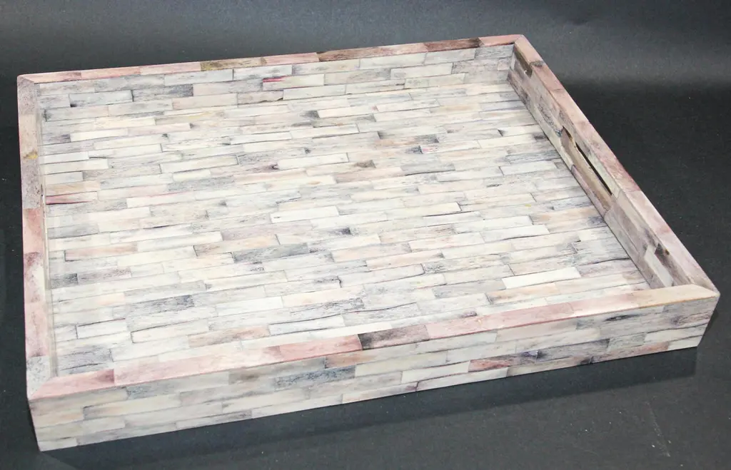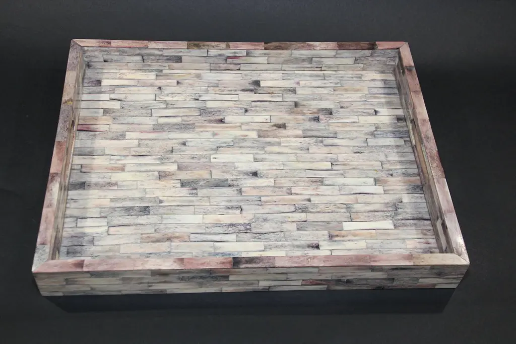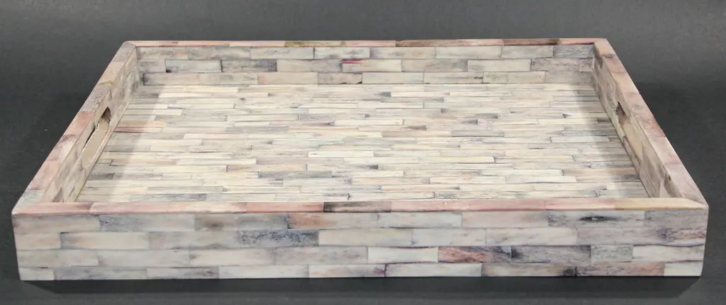 Large rectangular geometric patterned wood and white bone inlaid serving tray.Made of wood and then tessellated with dozen of sustainably sourced, hand carved rectangular bone chips in a subtle tone-on-tone pattern.This beautiful rectangular tray will make the perfect addition to any room and any decor, Modern, Traditional, Bohemian Moorish, Moroccan. Handcrafted in India.DimensionsHeight: 2 in. Width: 18 in.Depth: 14 in.