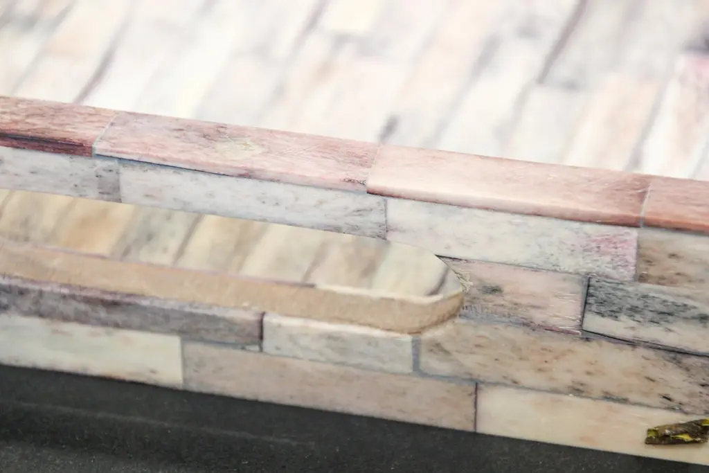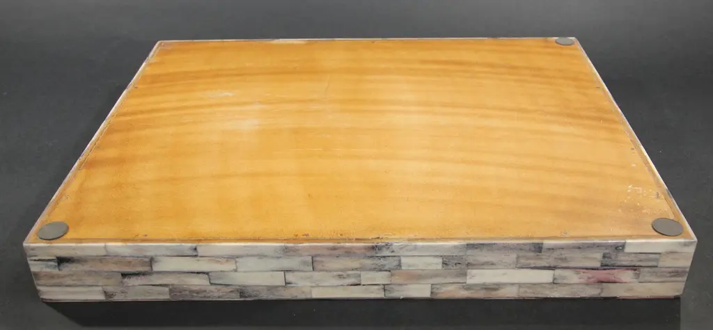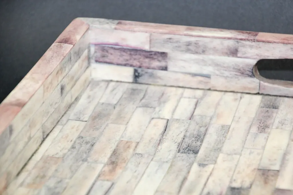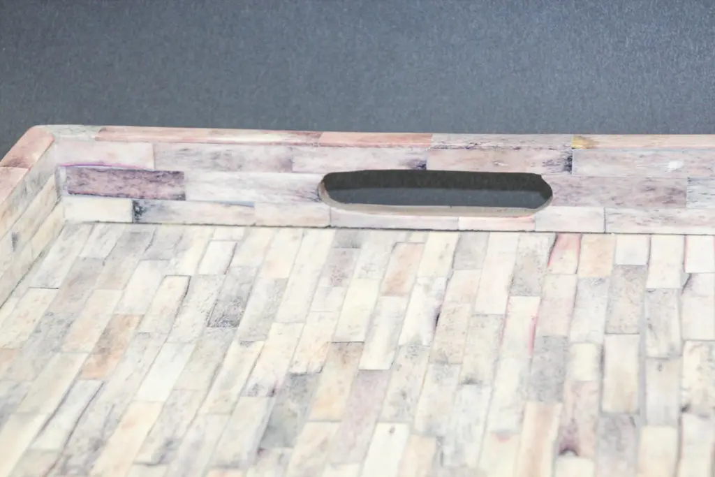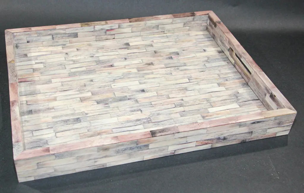 Large rectangular geometric patterned wood and white bone inlaid serving tray.Made of wood and then tessellated with dozen of sustainably sourced, hand carved rectangular bone chips in a subtle tone-on-tone pattern.This beautiful rectangular tray will make the perfect addition to any room and any decor, Modern, Traditional, Bohemian Moorish, Moroccan. Handcrafted in India.DimensionsHeight: 2 in. Width: 18 in.Depth: 14 in.