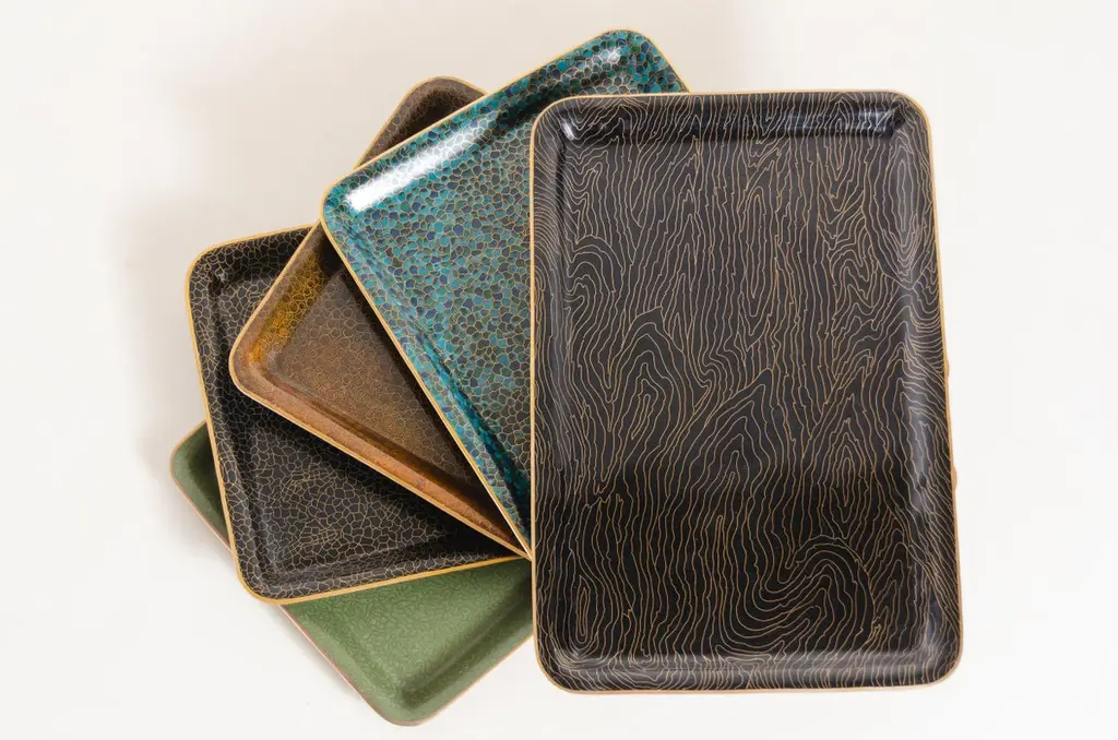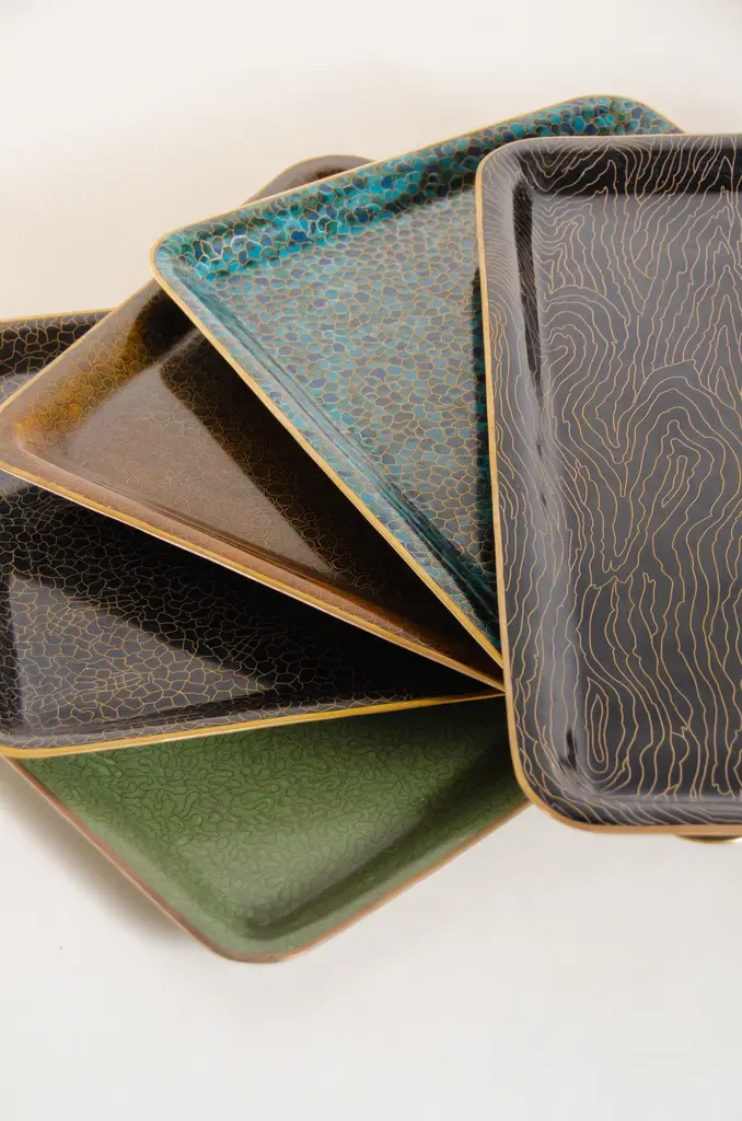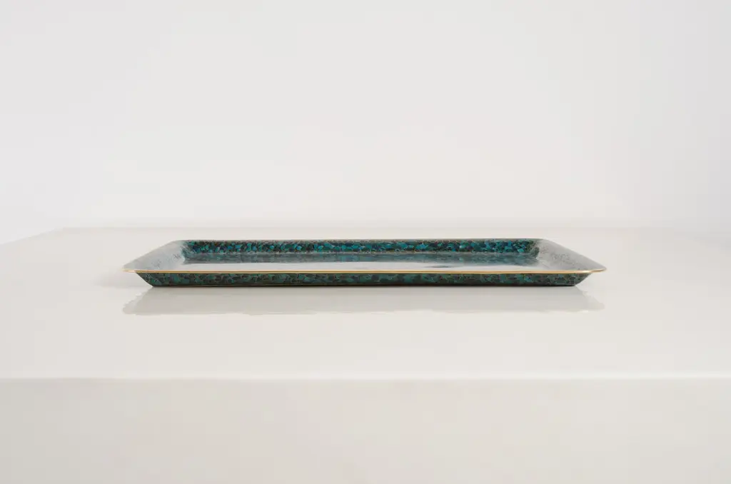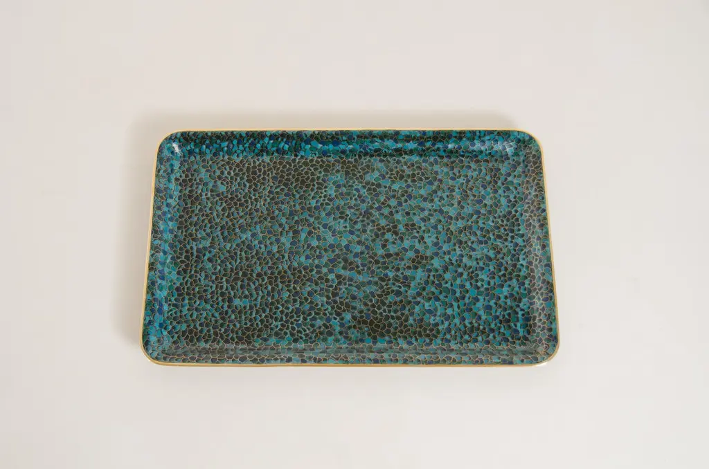 Rectangular trayMediterranean designShades of blueGlass enamelGold plated copperCloisonnéLimited editionEach piece is individually crafted and is unique.The cloisonné technique is an enameling on metal technique that dates back to the Byzantine Empire. The technique reached China around the 12th-13th century. In the 1980s, Robert Kuo began his repertoire with cloisonné and introduced flowing designs without compromising on the technical quality. He also created new matte cloisonné colors that are patented. He took a break from cloisonné to explore the repoussé technique and now returns to designing cloisonné but in non-monochrome colors, patterns and larger pieces.