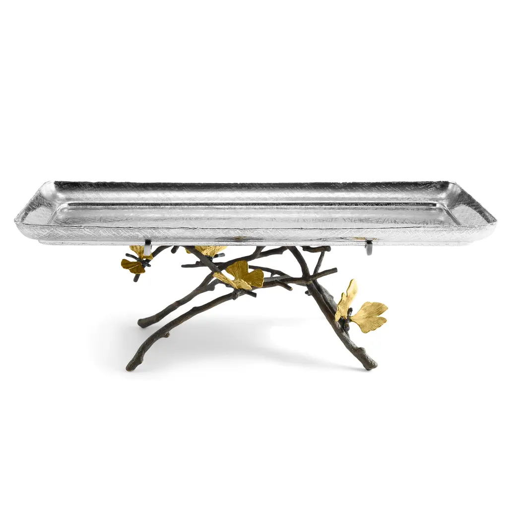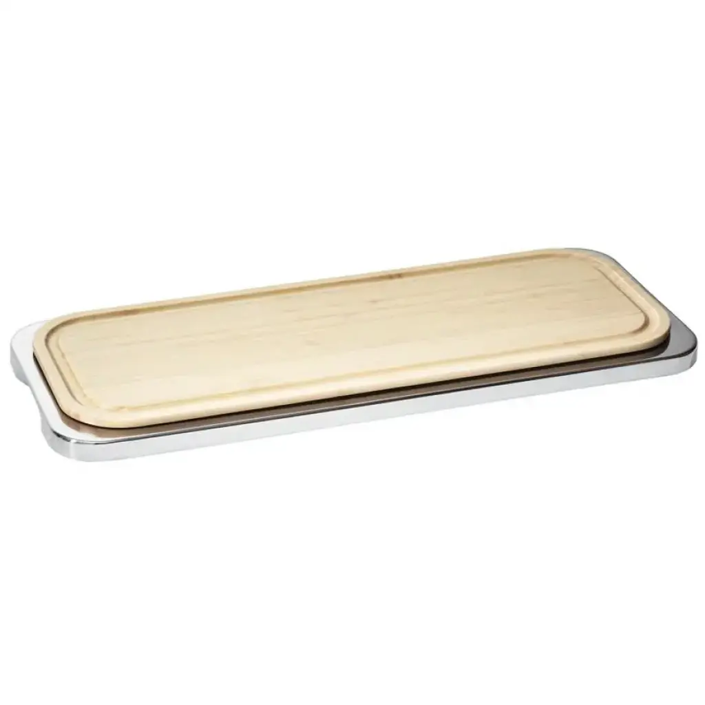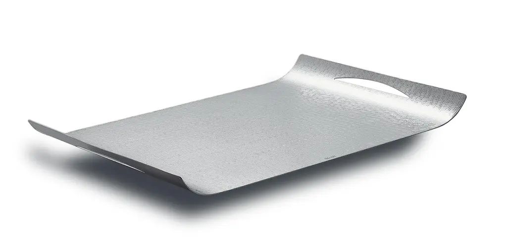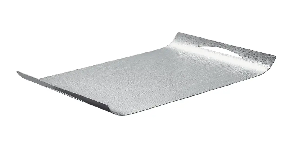 This is a glossy silver alloy Uno tray in a rectangular shape with curved edges.