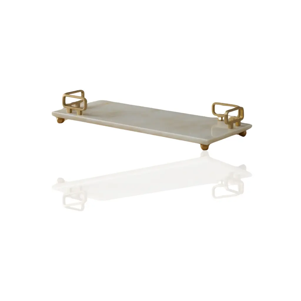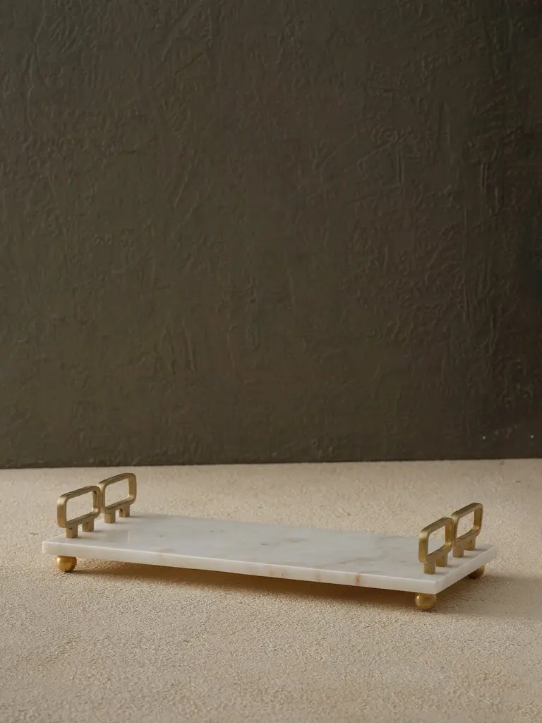 Sleek and structured, the Rectangular White Marble Tray with Double Square Gold Handles adds architectural elegance to your tabletop styling. Crafted from smooth white marble with soft natural veining, this tray is elevated on golden sphere feet and finished with distinctive double square handles in a matte gold tone. Its elongated silhouette makes it ideal for serving, organizing, or showcasing decorative objects, blending effortlessly into both modern and classic interiors with refined ease.