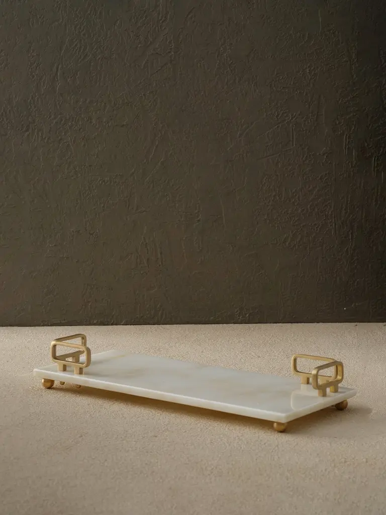 Rectangular White Marble Tray With L-Shaped Gold Handles