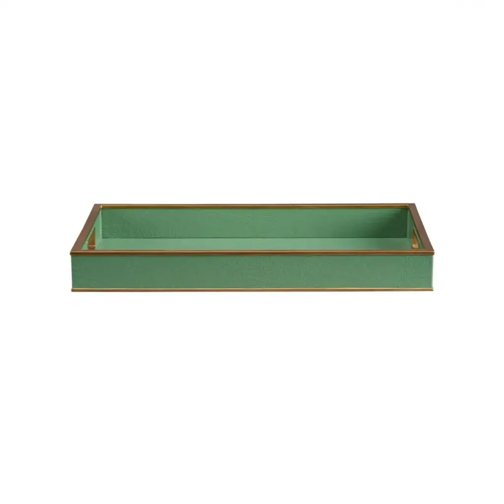 This chic tray features a green faux crocodile finish accented with gold edging, blending bold texture with refined elegance for a sophisticated statement piece. Designed by Shayla Copas.
