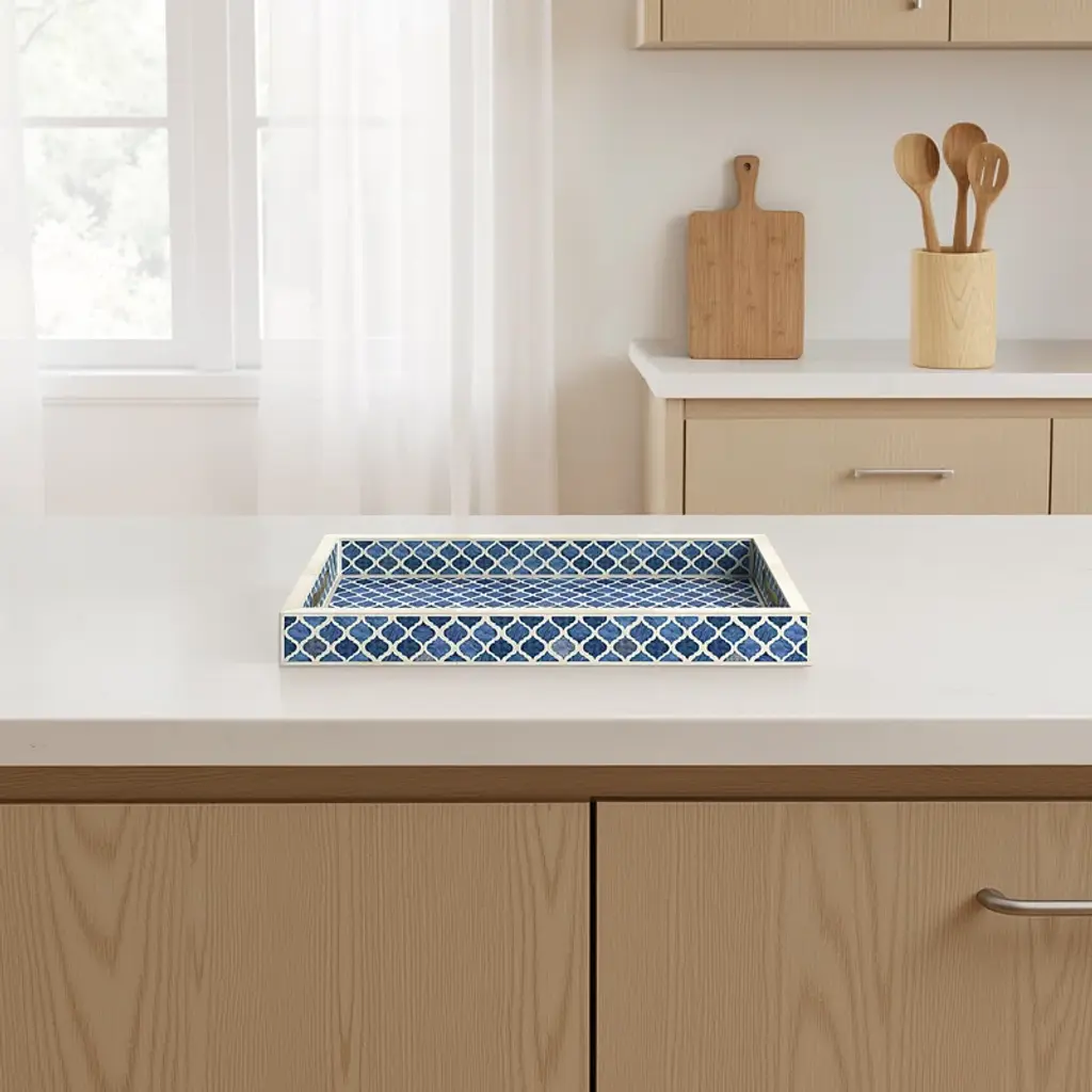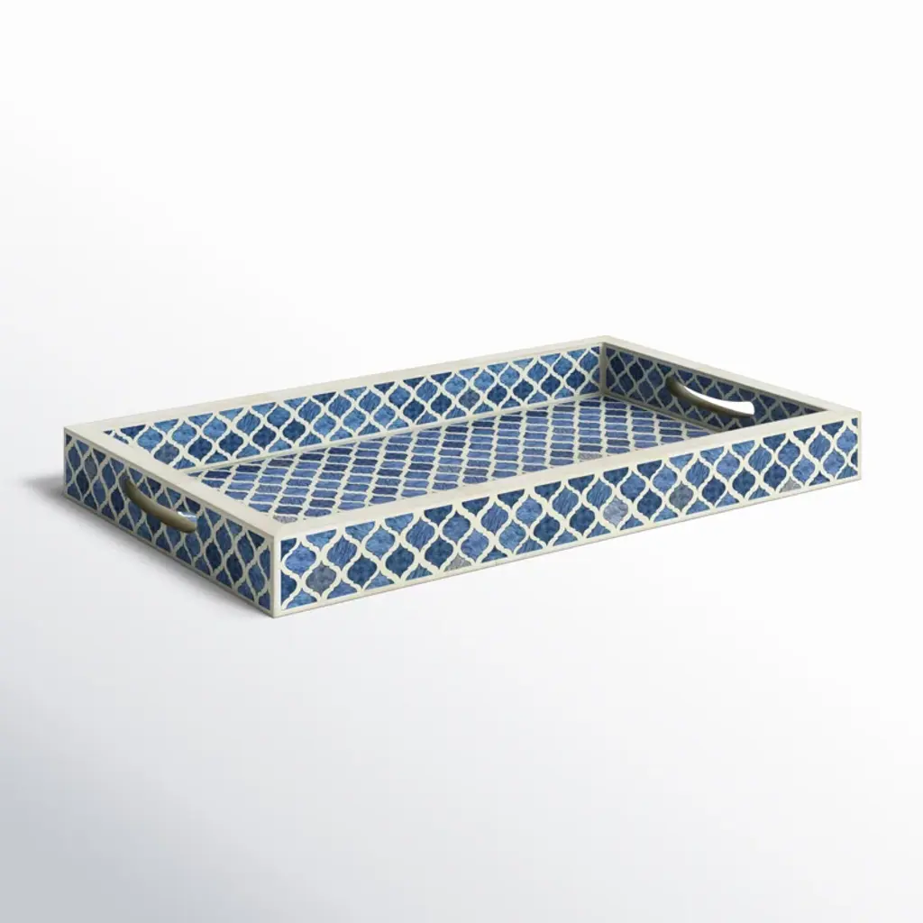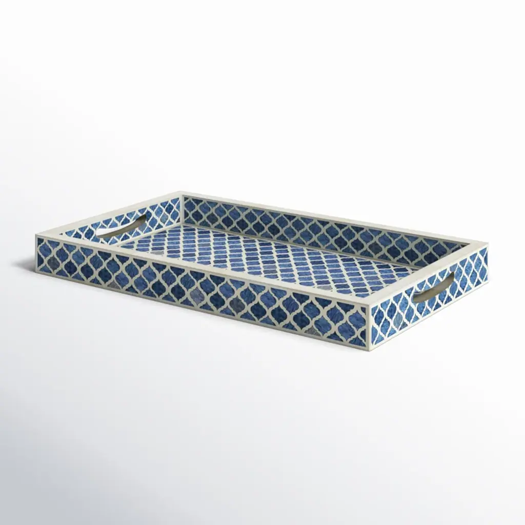 We love how this handmade serving tray brings an elegant coastal vibe to any home. Inspired by antique bone-inlay designs, this tray is handmade in India and showcases a mosaic motif in watercolor blue shades with a white background. It has a clean-lined rectangular silhouette and straight sides to help keep its contents in place. Plus, cutout handles make moving it a breeze. This tray is practically made for corralling makeup brushes and jewelry in the bedroom, or a few of your favorite candles on your living room coffee table.