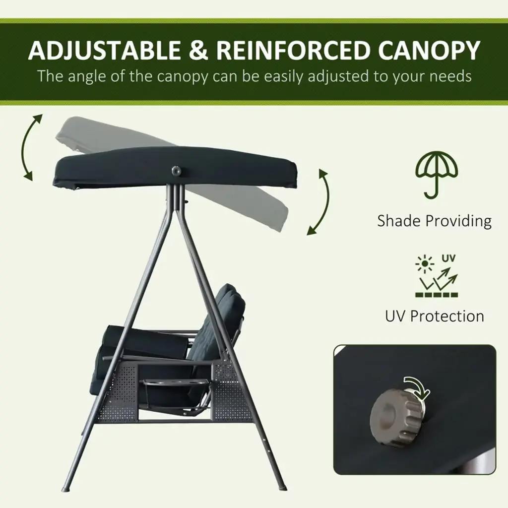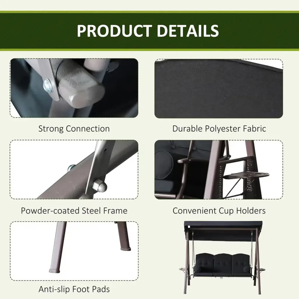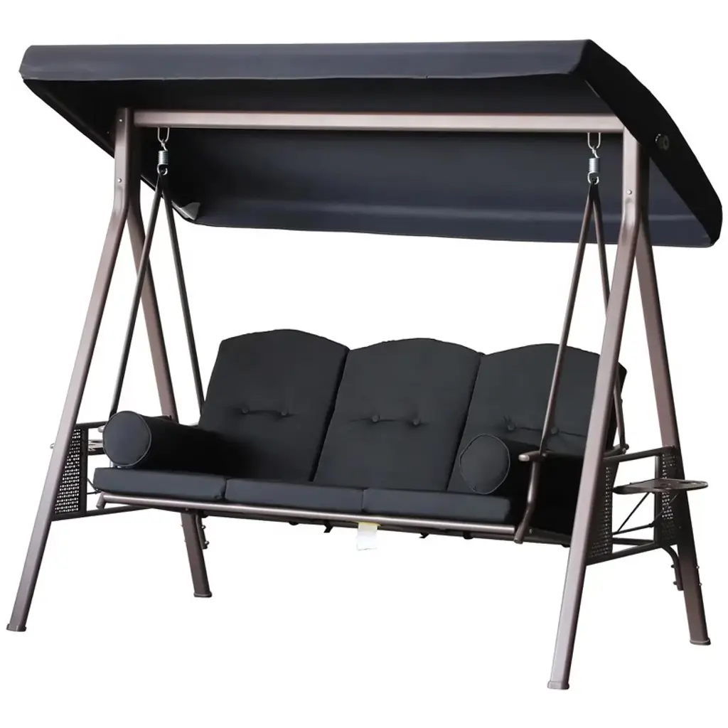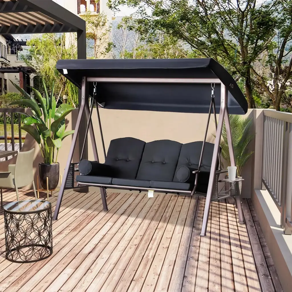 Resenkos 3-seat Swing Chair, Outdoor Glider With Canopy, Removable Cushions, Pillows, Side Trays, Garden, Black